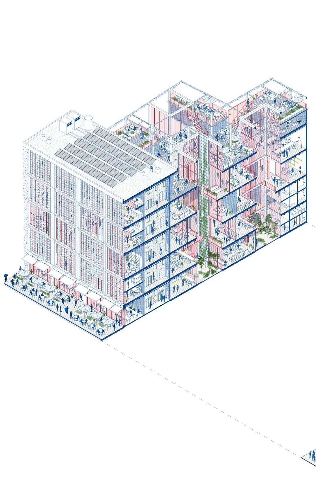 Axonometric view of the proposal, scale 1:200