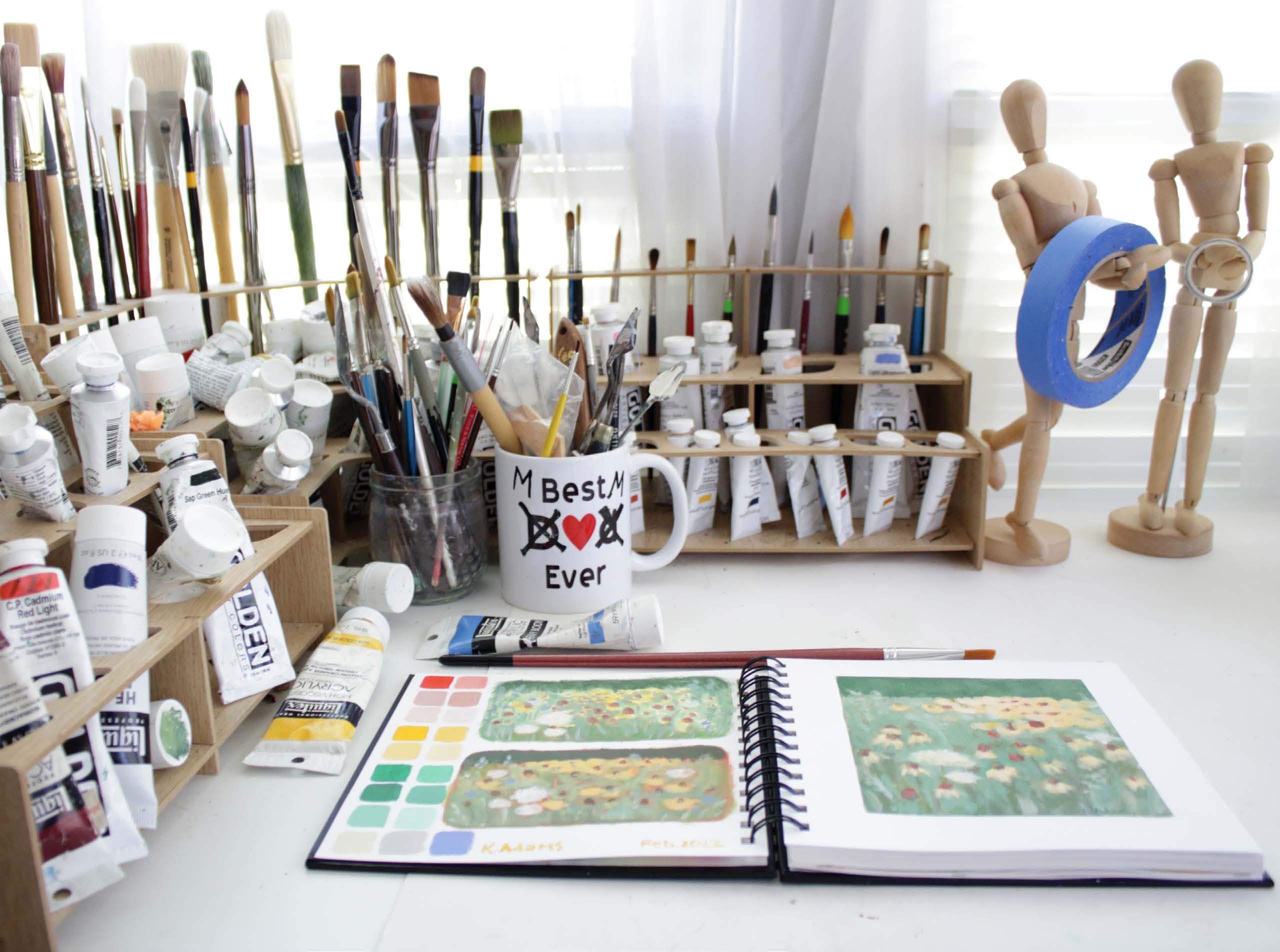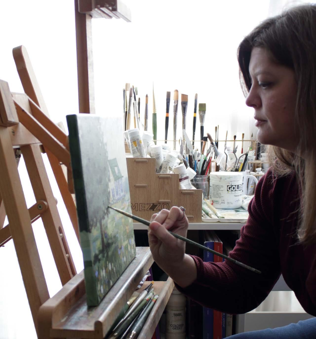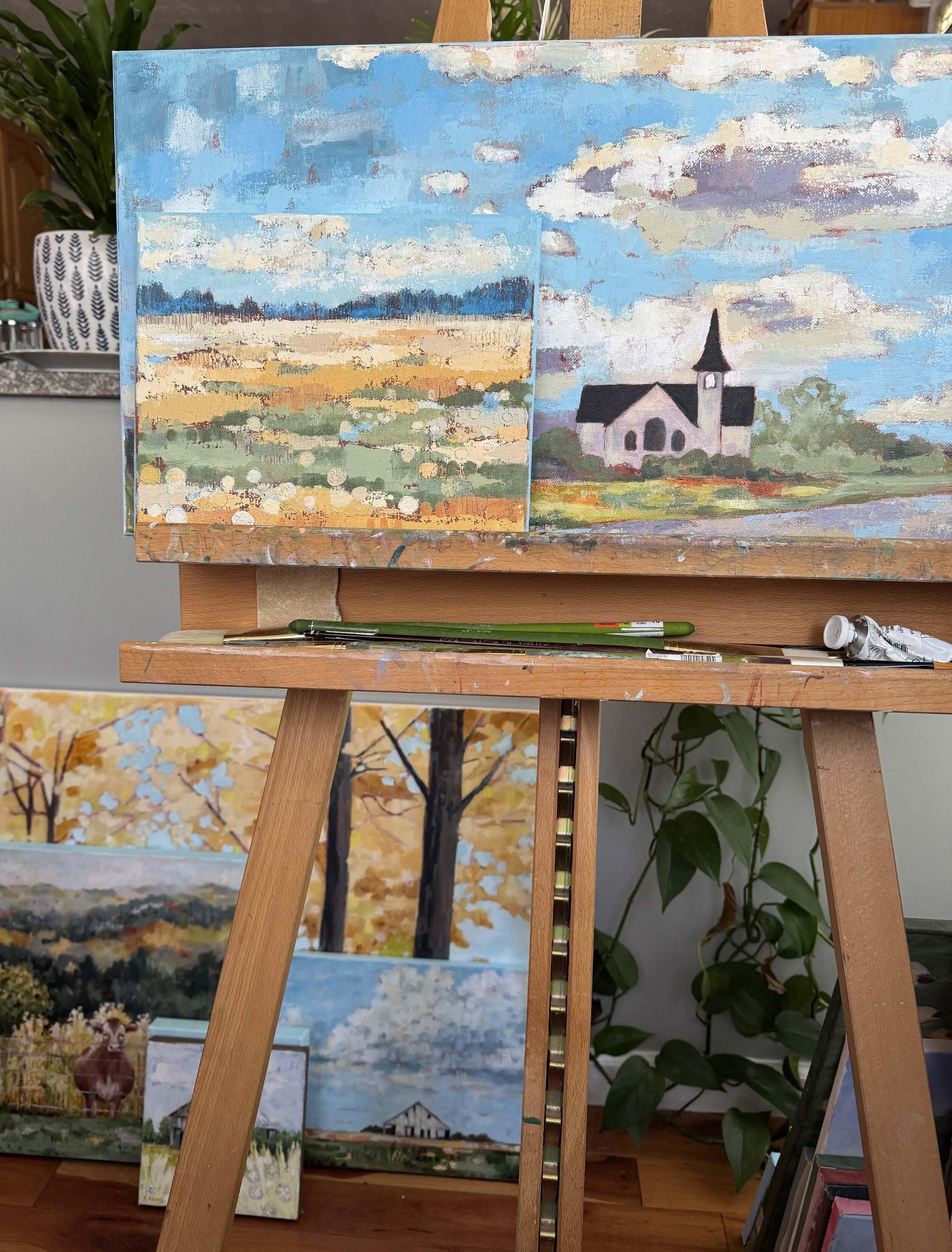Her studio is tucked into the breakfast nook of her home, chosen for the light and the practicality. On any given day, she might be painting, making supper, or folding laundry, sometimes all at once.
