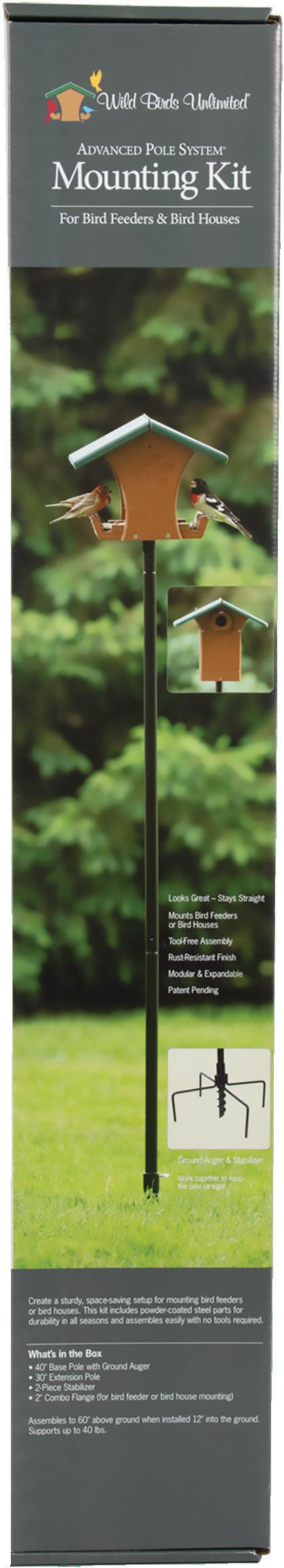 Our exclusive Advanced Pole System Mounting Kit makes it easy to create a sturdy setup for bird feeders or bird houses. Designed for easy installation, the powder-coated steel parts install and connect without tools. The built-in Ground Auger and Stabilizer keep the setup standing straight year-round. Plus, the modular design lets you expand or adapt your setup with additional accessories (sold separately).