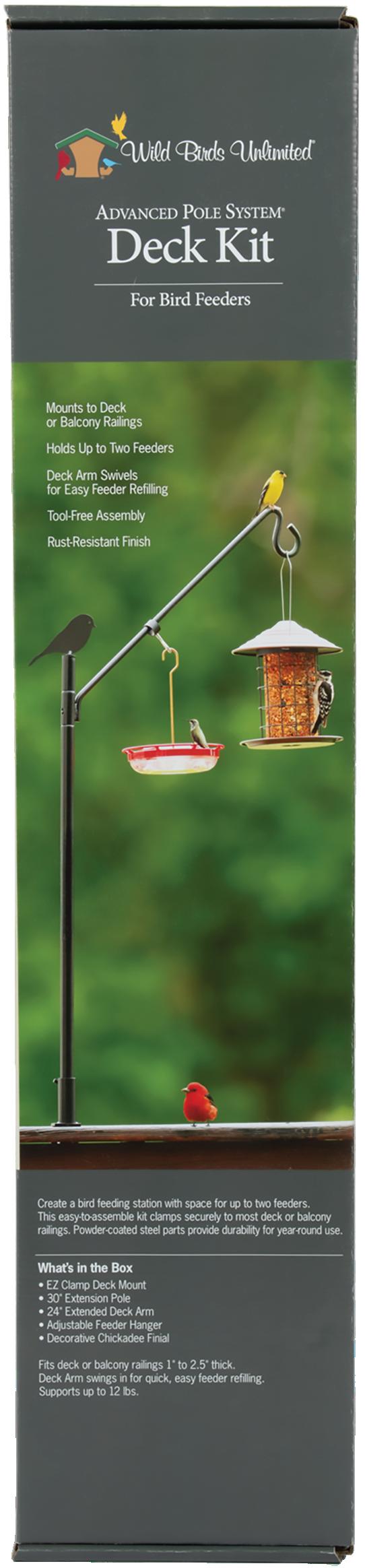 Our exclusive Advanced Pole System Deck Kit makes it easy to create a custom bird feeding station on most deck or balcony railings. The deck arm swings in for quick, easy feeder refilling, and all powder-coated steel parts connect without tools. Its modular design lets you expand or adapt your setup through the seasons with additional accessories (sold separately).
