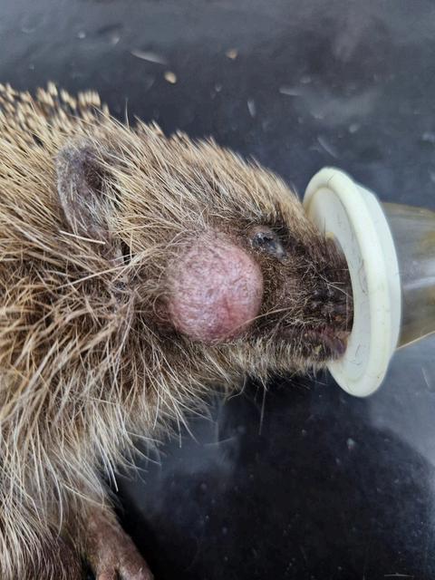 Whenthishedgehogfirstarrived,itwasclearhehadbeen strugglingforsometime Hisfacewasbadlyswollen, especiallyontherightside,withanunderlyingabscess Beneathhisjaw,thelymphnodewasenlarged,andseveral teethwererotten,makingitpainfulforhimtoopenhismouth, fully.Hiseyeswereswollen,too,andtheconjunctivainflamed, thoughhestillrespondedtohissurroundingsanddidn’t behaveasifhewasblind Tickscoveredhisbody,andhislow bodyconditiontoldastoryofhardship
