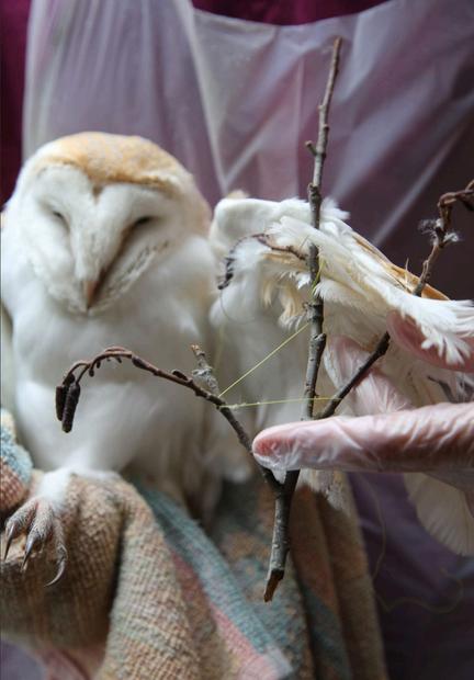 BackatWildlifeAid,ourvet,Raul,carefullyfreedthe owlfromthetangledfishingwire Oncloser inspection,wediscoveredthewirewastightly wrappedaroundhisfeathersbut,thankfully,had notcutdeepintothewing Thisgaveushopethattherewouldbenolastingdamage,justsome swellingthatneededmonitoring.