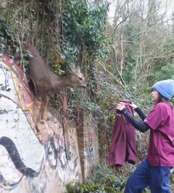 Ourwonderfulvet,Judith,gentlycoveredthedeer’seyestohelpkeephercalm,before administeringalightsedative,allowingtheteamtosafelyandcarefullyfreeherfromthefence