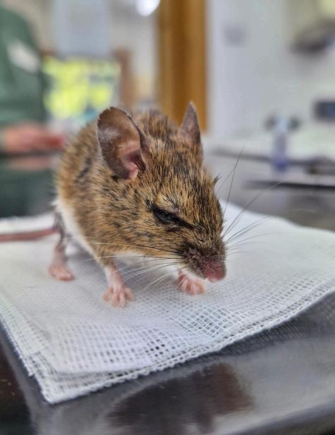 Thisyellow-neckedfieldmousewasbroughtintothe hospitalonthe30thofNovember2025,duetoacat attack Hesufferedalargewoundonhisback,mainly affectingtherightflankandrightbackleg.Althoughhis backlegwasdamaged,hewasstillmobileonallfour legs,however,wasverystressedandalert.