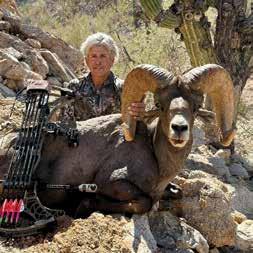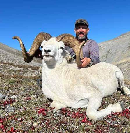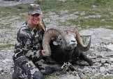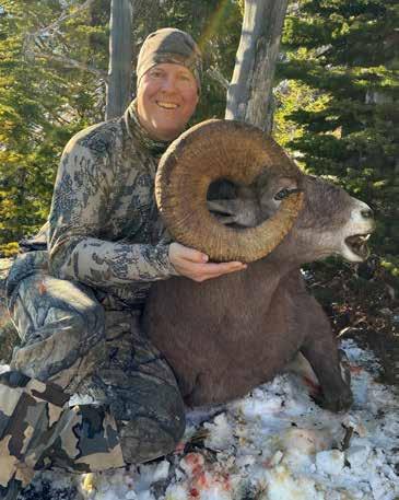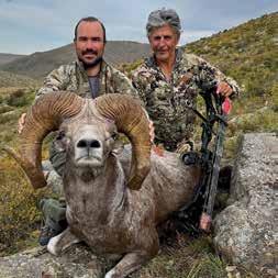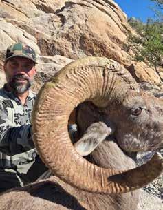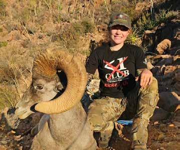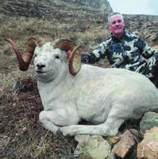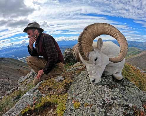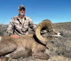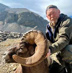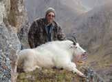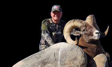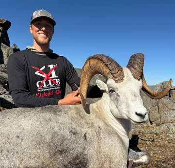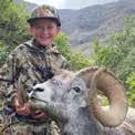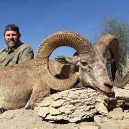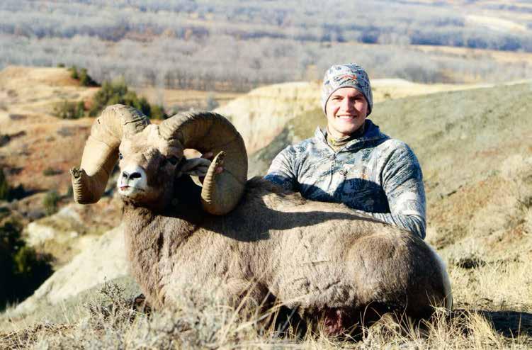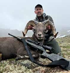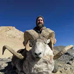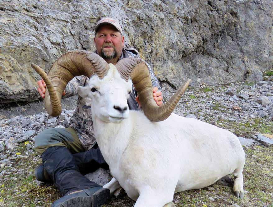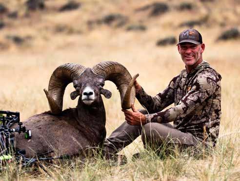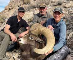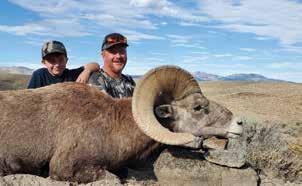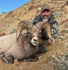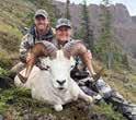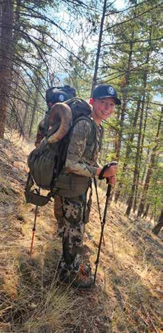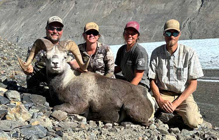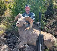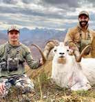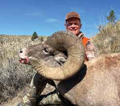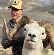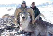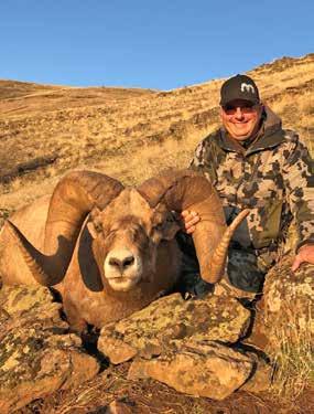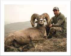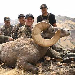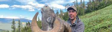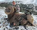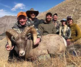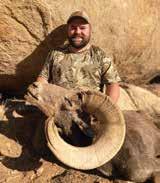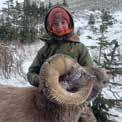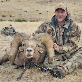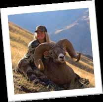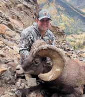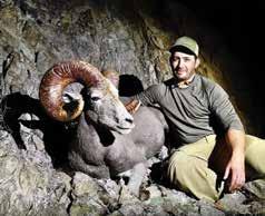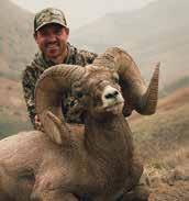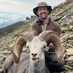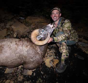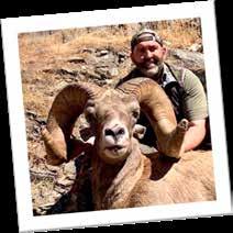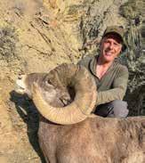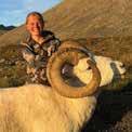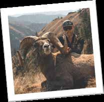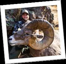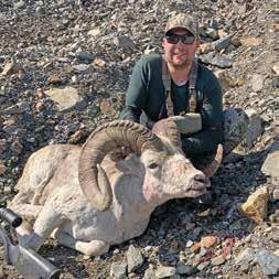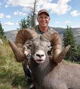the mountain to ensure that there wasn’t a blood trail following the ram. Around halfway up the next boulder field, I decided to investigate the chute he walked through with my binoculars. Something had caught my eye as I did. Being uncertain that what I had spotted was just a miscolored rock or an illusion, I asked my guide to use his spotting scope for a better view. Without a sliver of hope, I sat there and waited for his response which was, “I’m sorry to tell ya Jess...” Instantly I responded, “It is a rock isn’t it?” With a grin from ear to ear he said, “You got yourself a ram.”