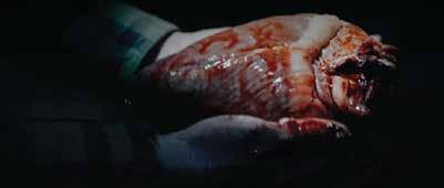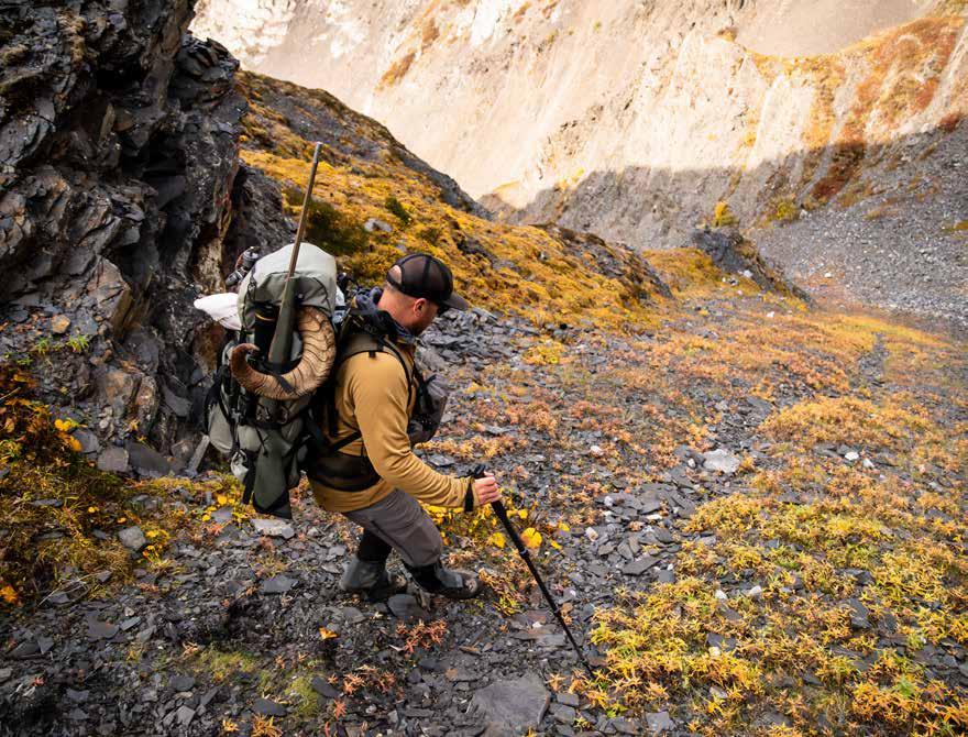 him anymore and I don’t know if he’s moving.” He ran behind us up onto the hill to see the ram from a higher elevation with his binoculars. I followed in case I had to get ready for another shot. Once we spotted him, we could tell he was still, and that’s when I started to shake. We got our packs together and although everyone was still calm, it felt as if we couldn’t get there fast enough. I had so much anticipation to just put my hands on him, and though I had him down, we still felt so far. The stream brought us to this animal in the first place, but it was now the obstacle keeping us apart. The rocks lining it seemed to be coated in snot and we struggled to find somewhere to cross. At this time, the sun was starting to crest into the drainage. Time was not stopping for us, and there were signs. Once again, we had to lose sight of our target, this time as we went through a dip in terrain. Once we gained sight of the rocks again, however, it was immediately apparent that they all looked the same It was not until the last 50 yards that we once again had eyes on him.
