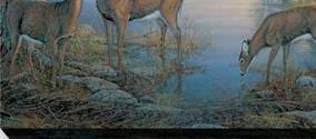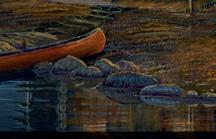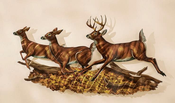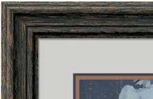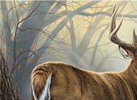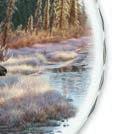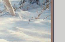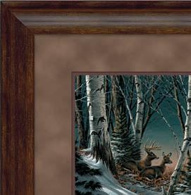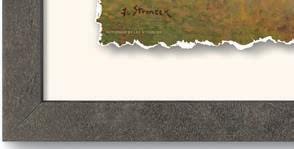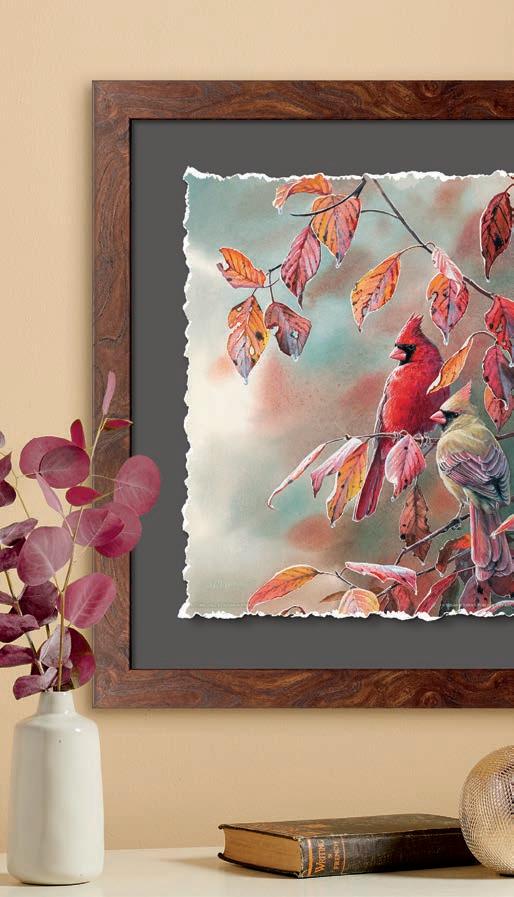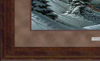 “On this peaceful winter evening, a 1930’s vintage sedan with headlights ablaze has fi nally reached its destination. The occupants will be visiting with old friends in the cabin. Nestled on the bluff the deer quietly watch, both part of and apart from the whole experience.” Elite open edition. Image size, 14"H x 24"W. Framed size, 25"H x 35"W with 2½" modena vintage fi nish moulding. Double matting with earthen-brown faux suede outer mat and nameplate. ©Terry Redlin. Published by Wild Wings® a division of Art Brand Studios, LLC. Print No. 135703 $90 Framed (as shown) No. 135625 $350