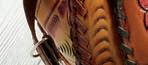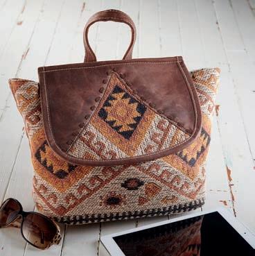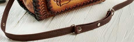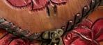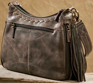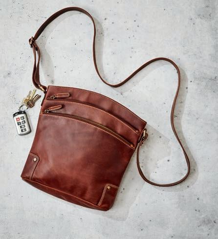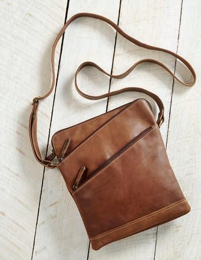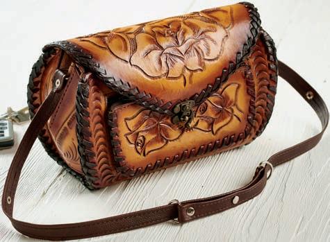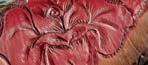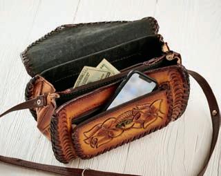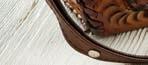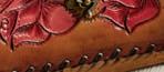 Artwork on the go! Crafted of genuine, hand tooled cowhide leather, handbag goes to shoulder bag with two snaps. Top flap with twist lock closure. Plenty of pockets with front zipper pocket, inside center zipper pocket, and back wall pocket. Fabric-lined interior. Four metal feet on bottom. No two are alike, expect some variation in base leather color. 9"H x 11"W x 9"D. Specify color. ❖ $220 each Red Flower No. 137755 Tan No. 137754
