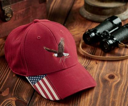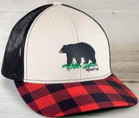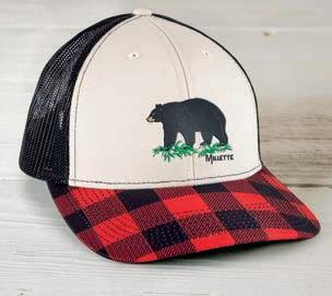 Practicality meets a rustic flair with a trucker hat, featuring a stone-colored front, a mesh black back, and a buffalo plaid lid. The 6-panel hat comes with a plastic snapback closure, contrast stitching. Embroidered bear artwork “Shadow of the Forest” ©Rosemary Millette. Imported. Specify personalization up to 10 characters. No. 148506 $59.95