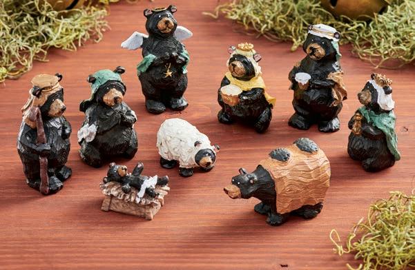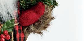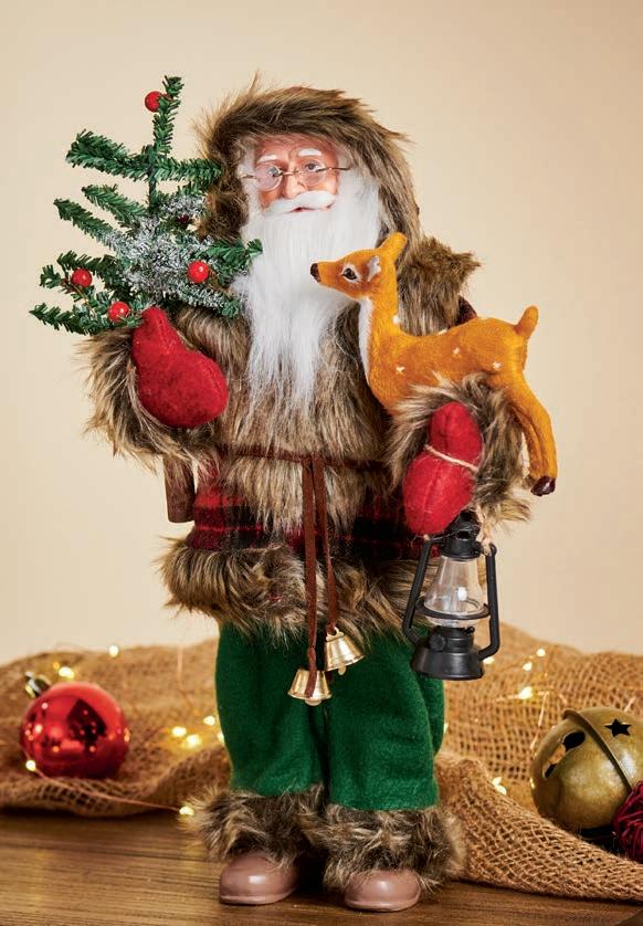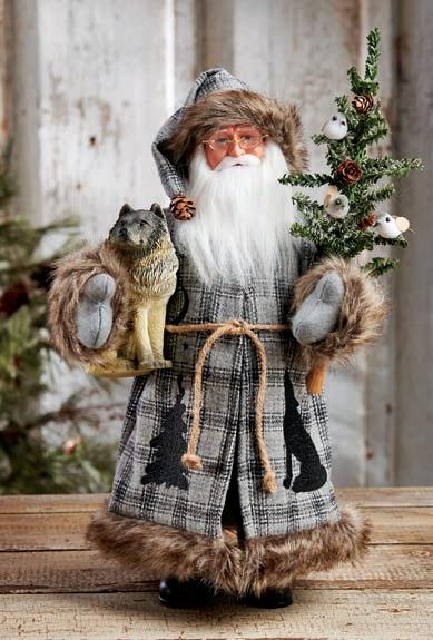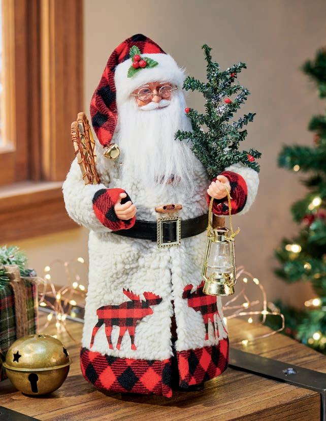 Finding the perfect Christmas tree is hard work, and nobody takes the job more seriously than Santa Claus. Wearing one of his favorite white faux fur coats, featuring a pair of buffalo plaid moose and trimmed with coordinating red and black plaid, Santa scours the woods for this year’s winning tree. Snowshoes and lantern accessories complete the look. Poly-cotton fabric, cold cast hands and face and posable arms. 16"H x 8"L x 5"D. No. 146927 $69.95