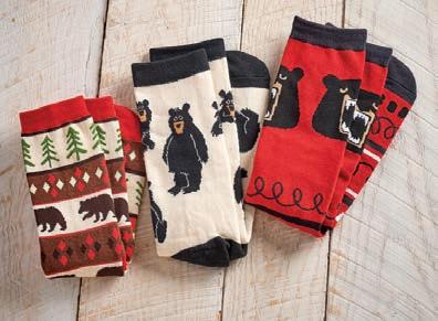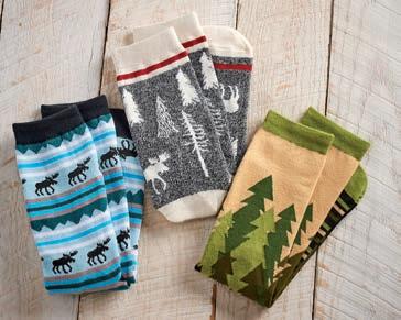 Give your feet some extra warmth with these fun Northwoodsstyle sock sets. Durable enough to hike all day and comfy enough to sleep in all night. Three-packs feature a variety of styles with contrasting heel and toe, 2-ply yarn for comfort and durability. Preshrunk. 75% cotton, 15% nylon, 10% spandex. Fits sizes 10-13. Specify design. $29.95 each Bear No. 148489 Moose No. 148490