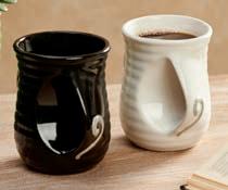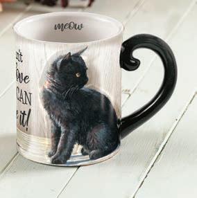 Snuggle up to your favorite hot drink and let the sculpted pocket warm your fi nger tips as you sip. Ridged for easy grip and contoured cat face and tail features for delightful amusement. Set includes one each black mug and white mug. Ceramic. 18oz. 5"H x 4¾"W x 4½"D. No. 138197 $34.95 set/2