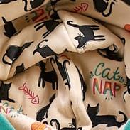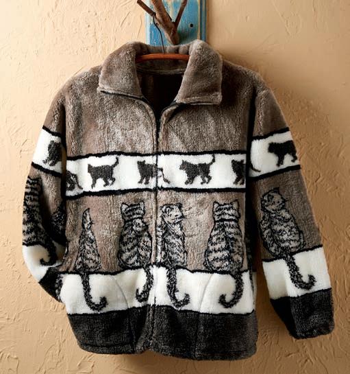 Cat lovers will purr with delight as they are warmly enveloped in the soft microplush fleece of this cozy jacket. Full-zip with side pockets. 100% acrylic with 100% polyester back. Machine washable. Brown with black and white. Specify size. $99.95 each
