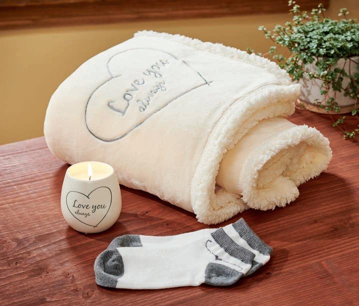 The people who make you feel warm inside deserve someone returning the favor. Why not show them how you feel with a blanket, candle, and sock set featuring a warm and loving phrase? Double-sided blankets are embroidered with caring sentiment along with matching aroma therapeutic candle and coordinating socks. Socks and throw are machine washable. Blanket, 50" x 60"; candle, 8oz.; women’s socks, size 8-12. Choose from “Family is Everything,” “Love You Always,” or “Happy Place” designs. Imported. ❖ $94.95/set