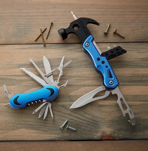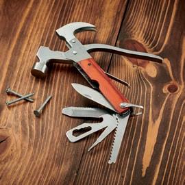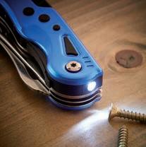 2-Piece Set is not just your average hammer, it includes a hammer head, nail puller, can opener, screwdriver tips, an LED light, and multiple wrench slot sizes. We paired it with a knife that includes a can and bottle opener, flat and Phillips head screwdriver, corkscrew, knife, scissors, fi le, and lanyard ring. All tools are made with durable stainless steel and aluminum. ❖