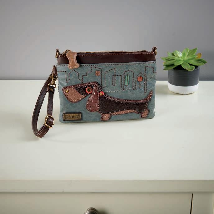 The paw-fect accessory for a dog lover! Gray faux leather crossbody bag is embellished with layers of colored faux leather and metal embellishments. Happy-go-lucky designs includes detailed stitching, hidden front zipper pocket, rear slide pocket, and a bone zipper pull for main compartment. Inside has turquoise blue polka dot design on coordinating brown inner fabric with pockets and slots inside for storing your credit cards and other essentials. Two adjustable, detachable straps allow for lots of options from crossbody style to shoulder bag or wrist clutch to handbag. 6"H x 8"W x ½"D each. Specify design. $64.95 each Loving Paw No. 137752 NEW Dachshund No. 148473