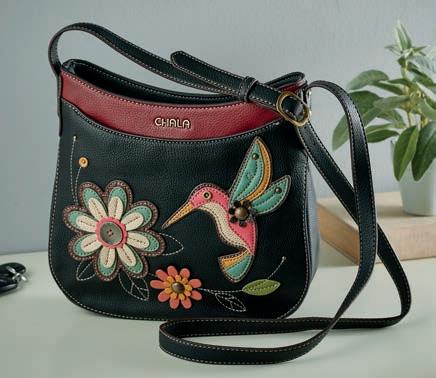 Handbag aficionados will be all aflutter when they see this uniquely decorated bag. Colorful faux leather layers in soft pink, turquoise blue, yellow, orange, green, and cream create a beautiful hummingbird and floral design on this black crossbody style bag. Front slide pocket with second hidden zipper for secure storage plus rear slide pocket. Top zipper reveals single roomy compartment with polka dot patterned inner fabric lining featuring inner slide and zipper pockets. Imported. 10½"H x 10"W x 3"D. No. 137751 $89.95