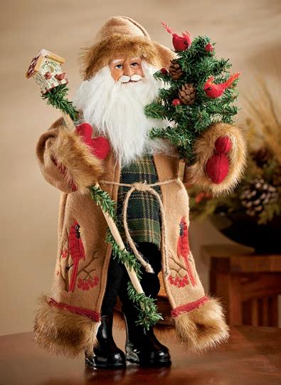 As colorful and cheerful as the bright red birds he loves, Cardinal Santa draws oohs and aahs. Meticulously hand-crafted, with embroidered coat and faux fur trim, decorated tree, birdhouse, hand-painted face and lambs wool beard. 16"H x 7½"W x 5½"D. No. 146933 $69.95