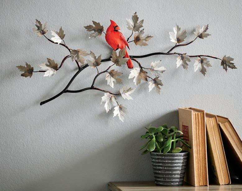 Silver branches and leaves frame a bright red cardinal on the lookout. Enamel powders are kiln-fi red on solid sculptural metal under intense heat to produce a vibrant color and rich depth to the handcrafted wall hanging. 12"H x 25"W x 3"D No. 140044 ❖ $425
