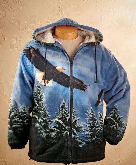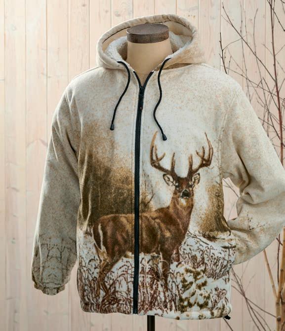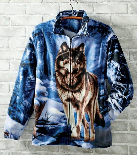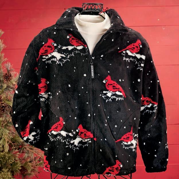 Welcome a chill in the air when you can slip on this stunning micro-plush fleece jacket! Brilliant red cardinals on a snow-covered pine bough are a striking contrast on black backdrop. Full-zip with elastic cuffs and cozy stand-up or fold-down collar. Micro-plush of 100% acrylic with 100% poly back. Machine washable. Specify size. $99.95 each S(38-40) No. 137815 L(46-48) No. 137807 XXL(54-56) No. 137823 M(42-44) No. 137811 XL(50-52) No. 137819