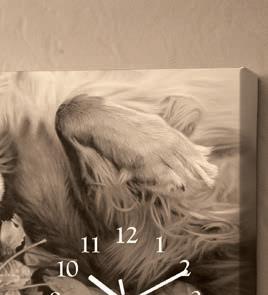 “Until one has loved an animal, a part of one’s soul remains unawakened.” ~ Anatole France. The joyous scene of a dog rolling in the fallen leaves is exquisitely portrayed on this wrapped canvas wall hanging. It also serves as a functional clock. Decorative hands complement the image. Precision quartz movement. AA battery required (not included). 13"H x 18"W x 1¼"D. Featuring image “Fall Festival–Golden Retriever” ©John Aldrich. Produced by Wild Wings® a division of Art Brand Studios, LLC. No. 137022 $39.95