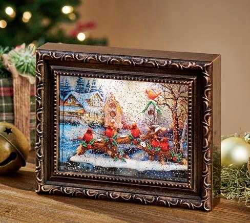 What songs might cardinals sing beyond their cheerful call? Colorful cardinal-fi lled scene lights up, swirls glitter, and plays eight different Christmas tunes when you switch on the water-fi lled frame. Battery-operated with optional DC port and USB cable provided. 9"H x 11"L x 3"W. No. 146573 $110