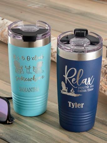 You’ve got a busy day, and you need high endurance drinkware that can travel with you no matter what life throws at you. Designed to fit most cupholders, durable engraved tumblers can be personalized with up to 15 characters. Laser engraved design on a powder-coated fi nish will not chip, fade, or peel off. Standard lid with straw opening or the snap lid. Interior is 18/8-gauge stainless steel. Handwashing recommended. 20oz. 67⁄8"H x 33⁄8"L. Specify design and personalization. ❖ $54.95 each Hummingbird in Coral No. 148484 Cardinal in Red No. 148485