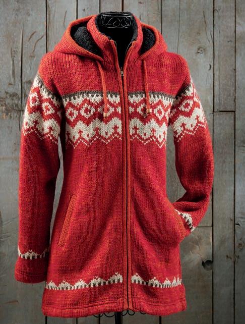 We have you covered! Enjoy ultimate comfort in a 100% New Zealand wool sweater jacket with a stunning black and white snowflake pattern and festive red accents. Jacket is fleece-lined with high collar, removable hood, inside zippered pocket, and inner draw string. The best feature is extra-long coverage extending to mid-thigh. Fleece-lined mittens and beanie keep you warm all winter. Dry clean or wash cold; lay flat to dry. Imported from Nepal. Unisex sizing with slimming tailored fit. Specify size. $240 each