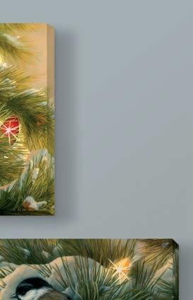 Art comes to life! The shining lights provide soft radiant glows from behind these wrapped canvases, adding drama and unexpected beauty. Ready to hang. Convenient on/off switch. LED lights require two AA batteries (not included). 13"H x 18"W x 1¼"D each. ©Rosemary Millette. Produced by Wild Wings® a division of Art Brand Studios, LLC. Specify image. $39.95 each Cardinal No. 130697 Chickadee No. 130698
