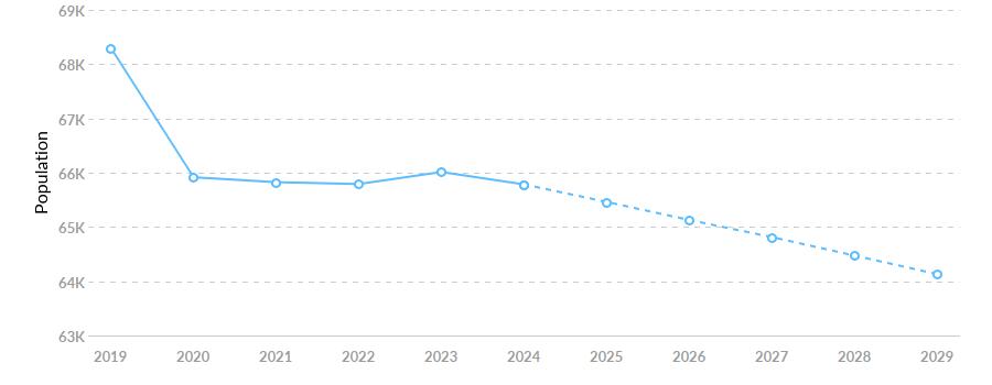As of 2024 the region's popula on declined by 3.7% since 2019, falling by 2,512. Popula on is expected to decrease by 2.5% between 2024 and 2029, losing 1,653.