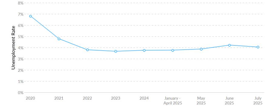 Wilkes County, NC had a July 2025 unemployment rate of 4.05%, decreasing from 6.82% 5 years before.