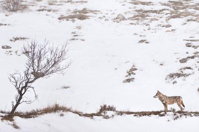 furtive Un pelage gris fauve se détache sur le blanc de la neige