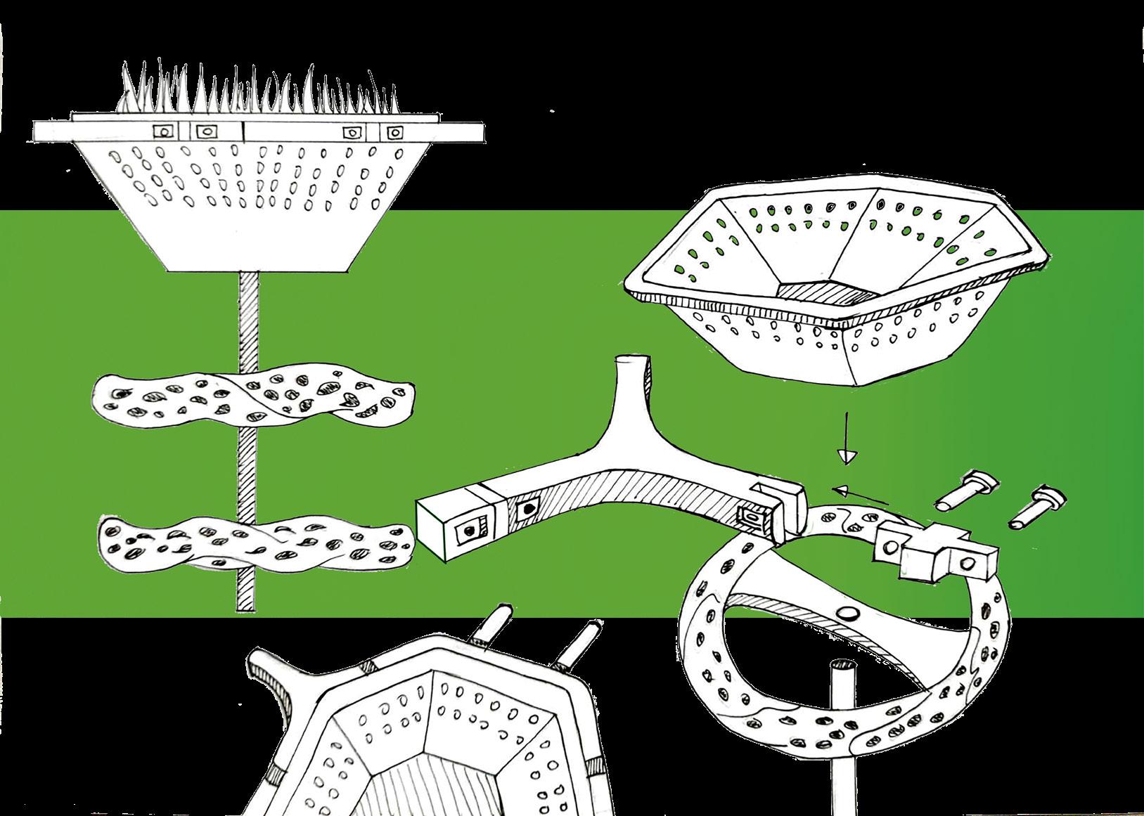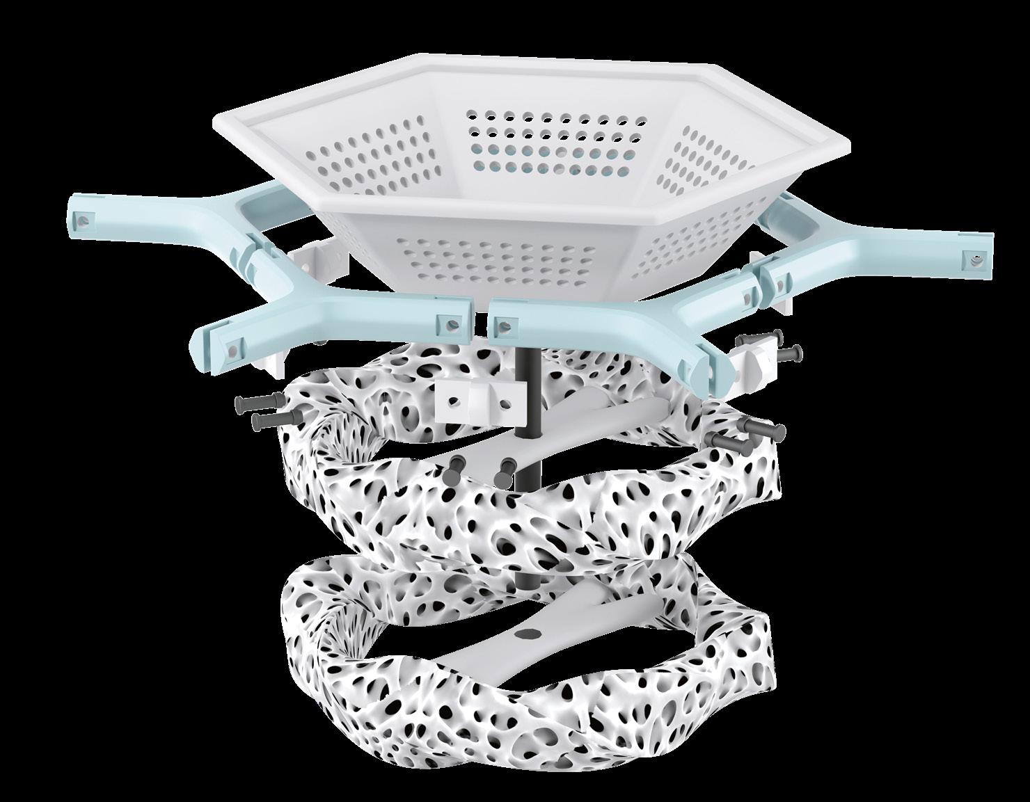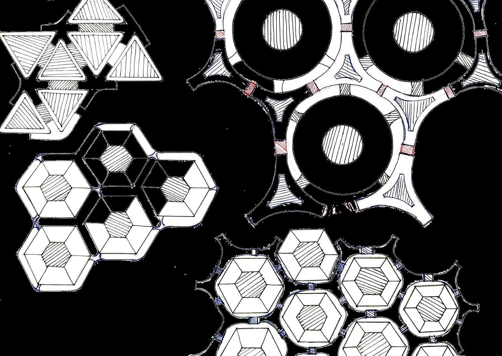 我們設計了一款創新三軸的帳篷,有別於以往充氣帳篷都是使用單軸一體式的,tentagon更具有穩 定性,充氣、洩氣速度也來的更快,在測試階段我們利用了海綿骨架,測試了多種跨維度骨架,最 終選定五角形的結構來做設計發展。