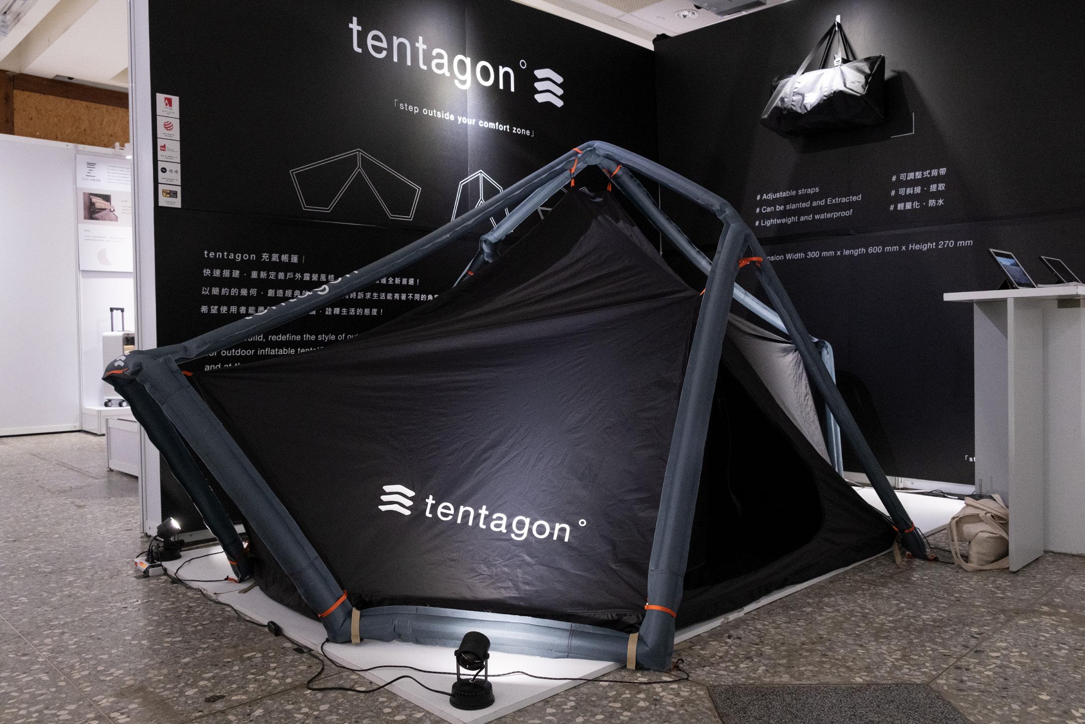 主要是給露營的初學者使用。與市面上的充氣式帳棚相 比,tentagon顯得更加輕便與技術性,採用了創新的 三軸氣柱技術,顛覆以往市面上一軸技術,讓整體帳篷 骨架有更良好的支撐結構,在材質方面也用環保布料。