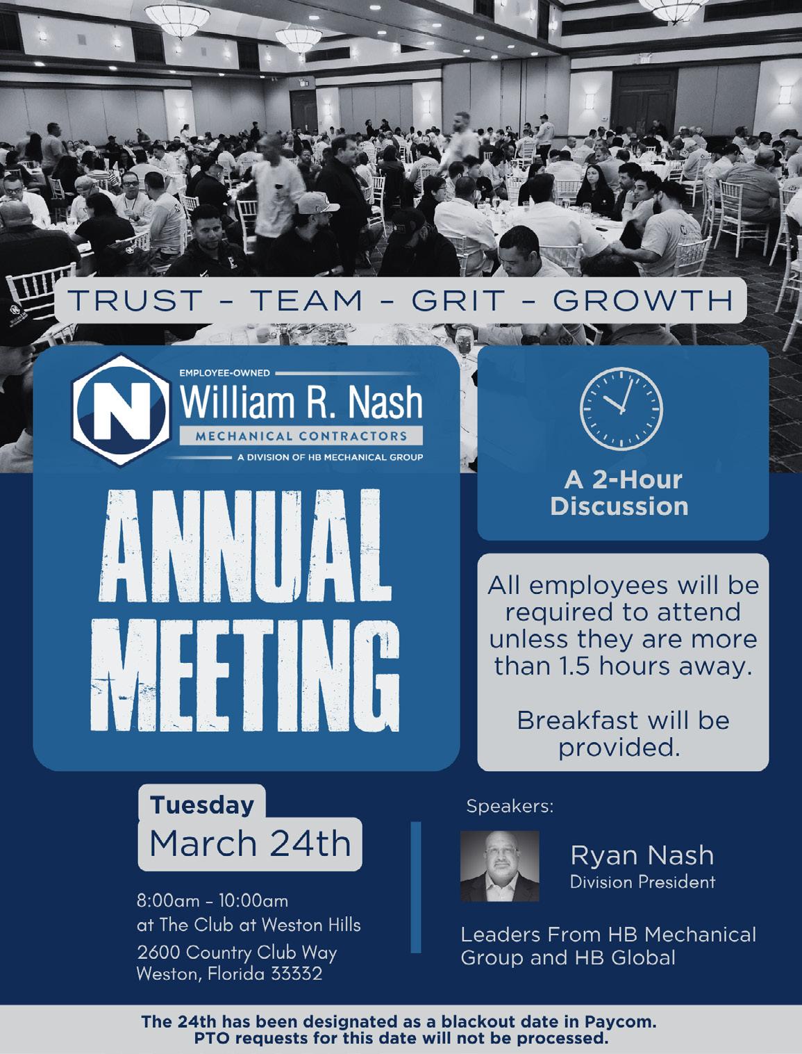 On March 24th, we will be gathering for our Annual meeting at Weston Hills Country Club with our leadership team, along with HB Mechanical Group and HB Global executives. We look forward to seeing you all there, as we discuss important topics amongst one another. If you have any questions, comments or concerns regarding our organization, please feel free to reach out to me either by phone at 786-402-1052, or by email at ryan.nash@wrnash.com.