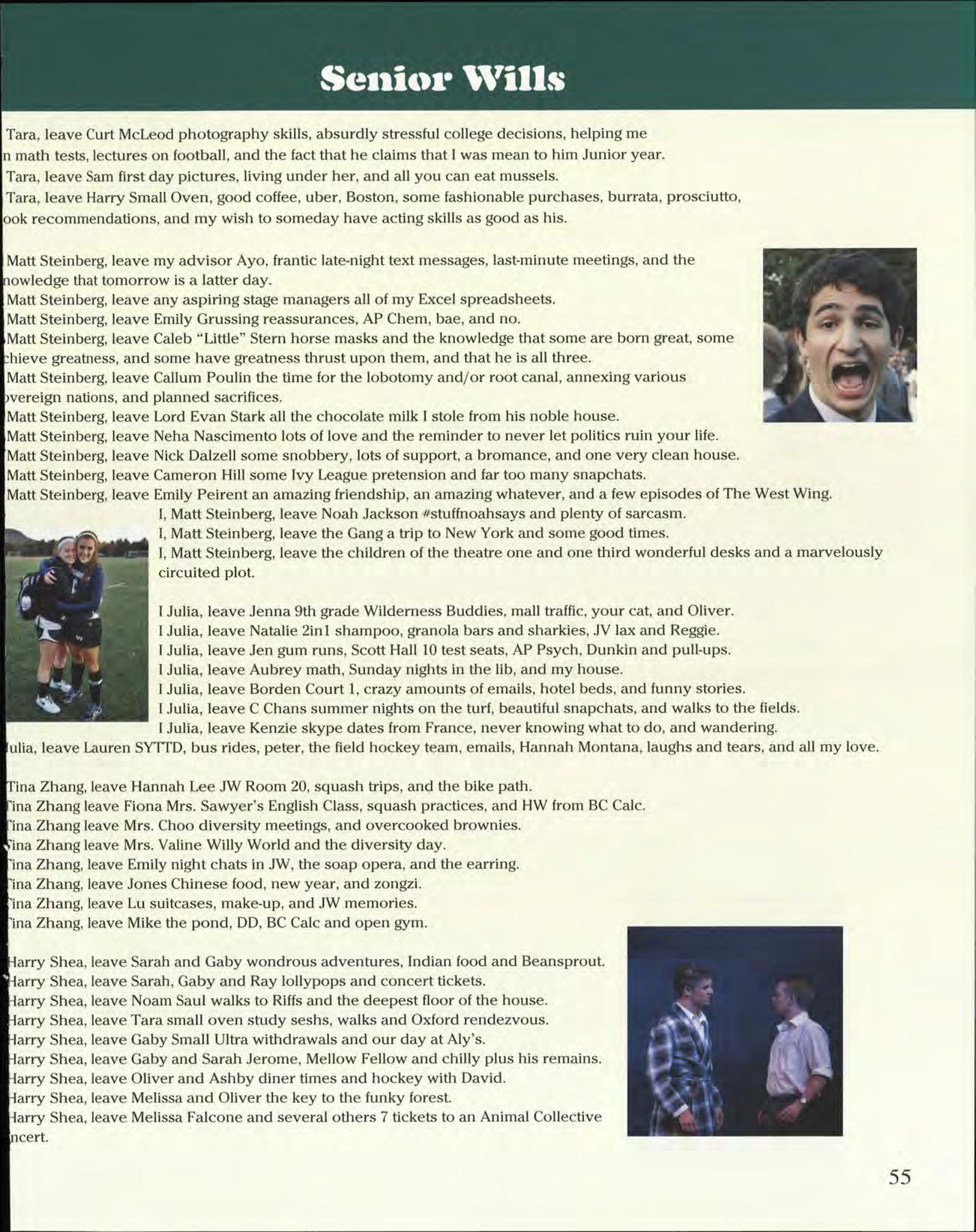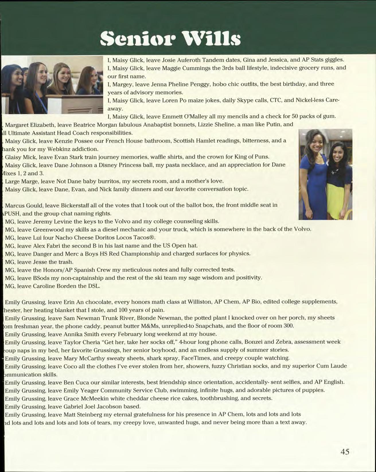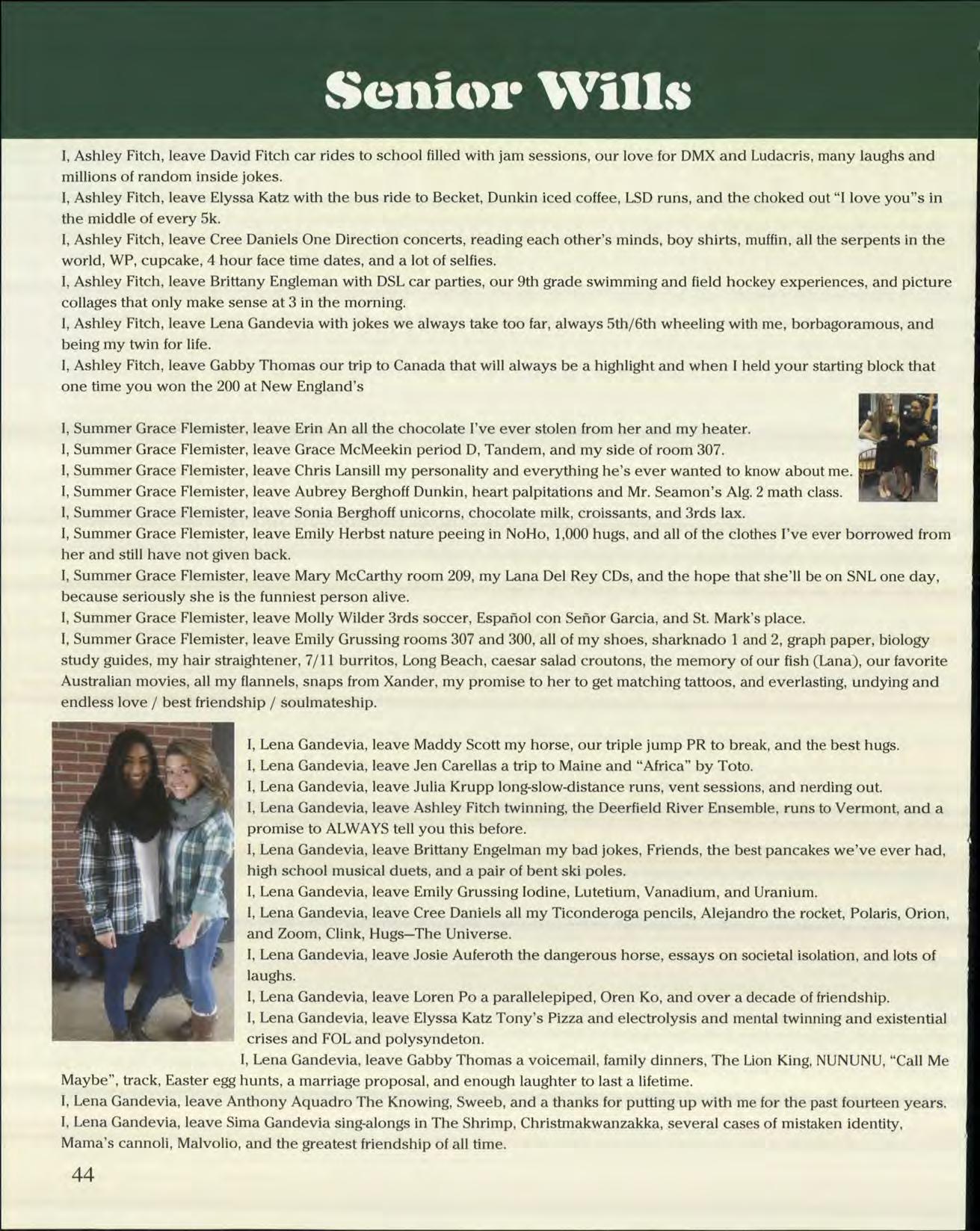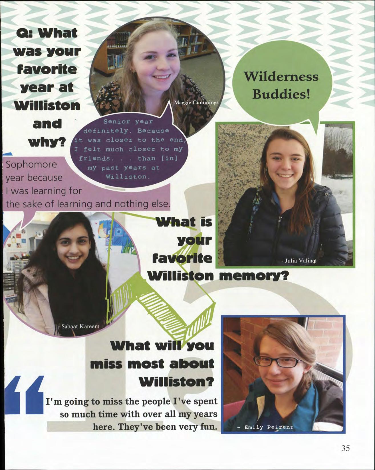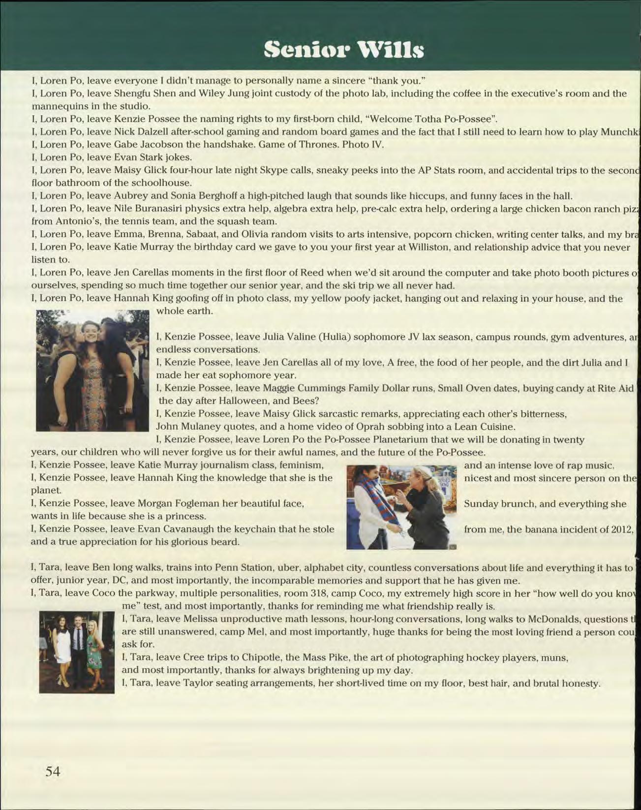 mily Peirent: We did it! I cannot thank you enough for having been the supportive, organized, and incredibly eliable editor and friend that you are throughout our time at Williston. You are the most diligent, responsible, nd caring person I have ever met, and I am so glad to have had you by my side. Truly, love you and thank ou.