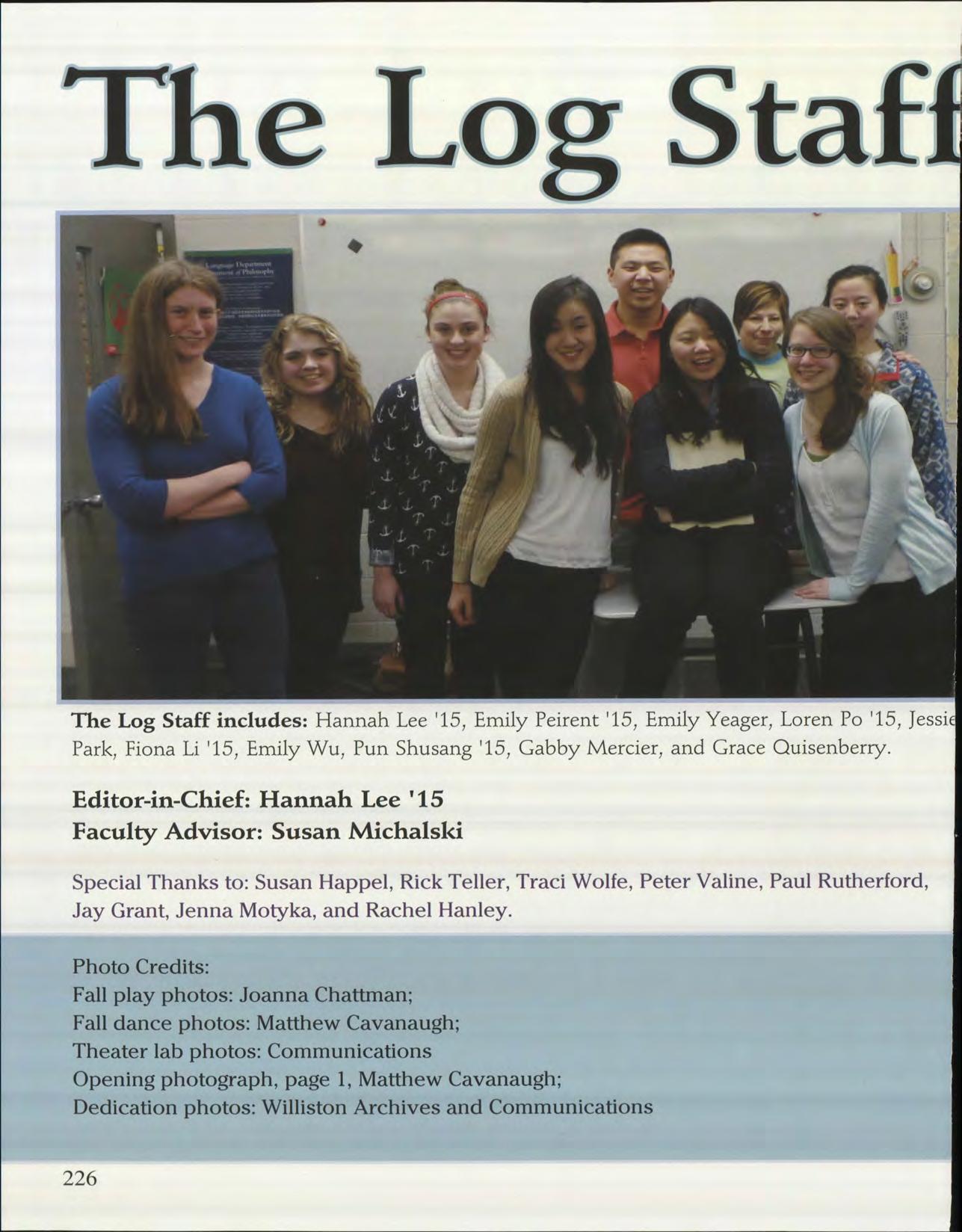 The Log Staff includes: Hannah Lee '15, Emily Peirent '15, Emily Yeager, Loren Po '15, Jessi Park, Fiona Li '15, Emily Wu, Pun Shusang '15, Gabby Mercier, and Grace Quisenberry.