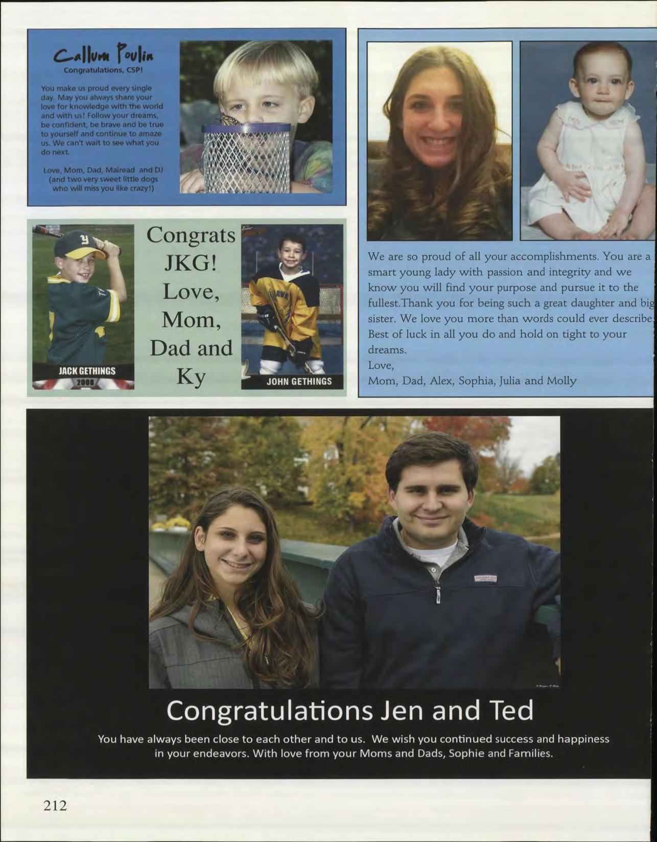 You have always been close to each other and to us. We wish you continued success and happiness in your endeavors. With love from your Moms and Dads, Sophie and Families.
