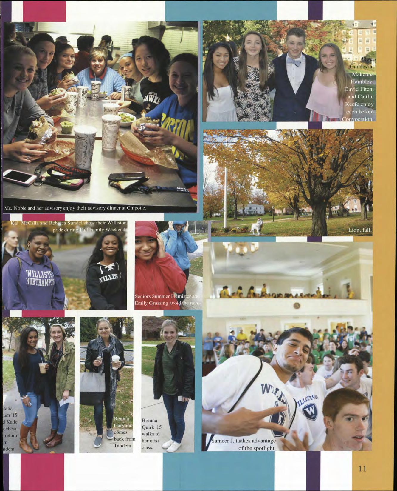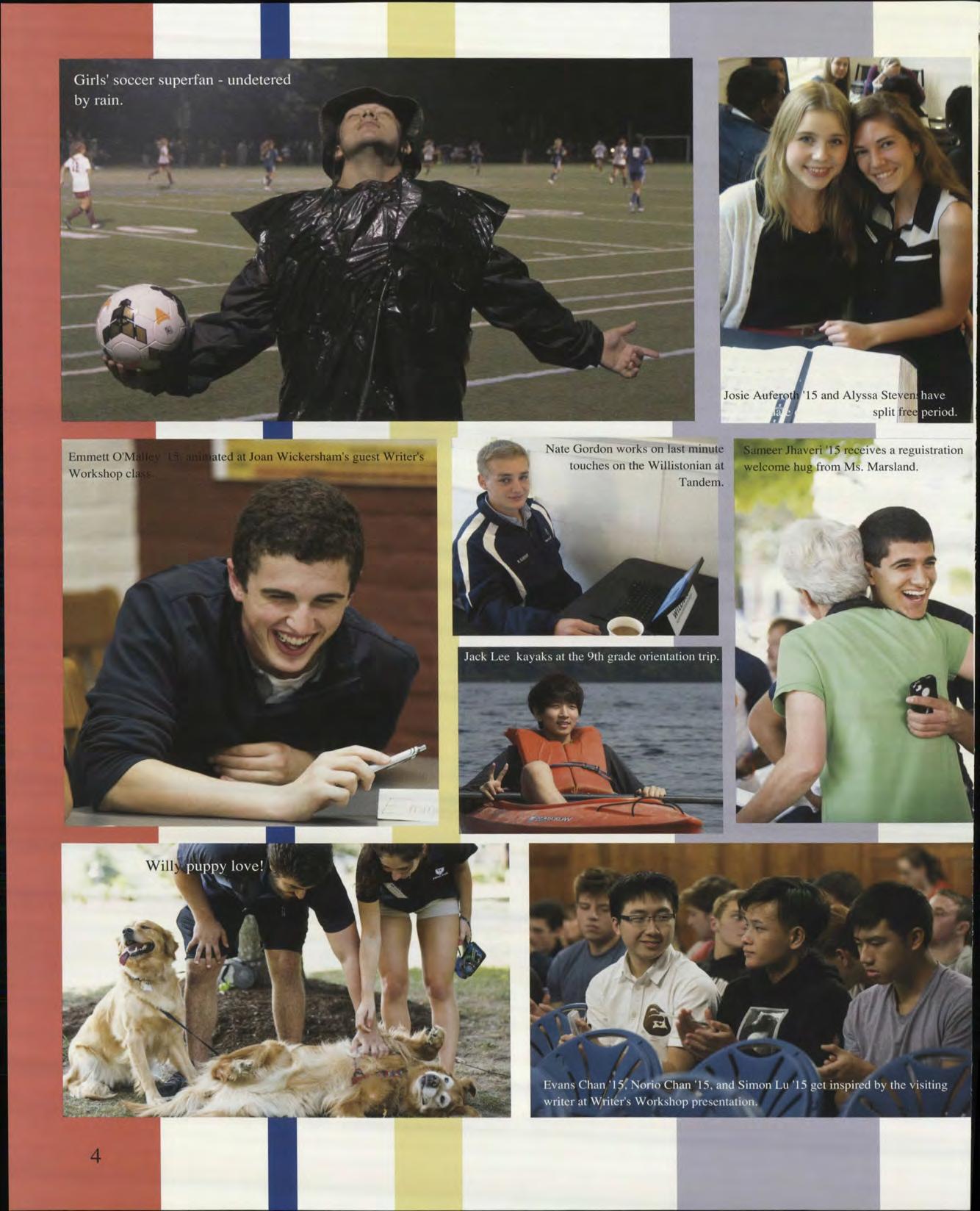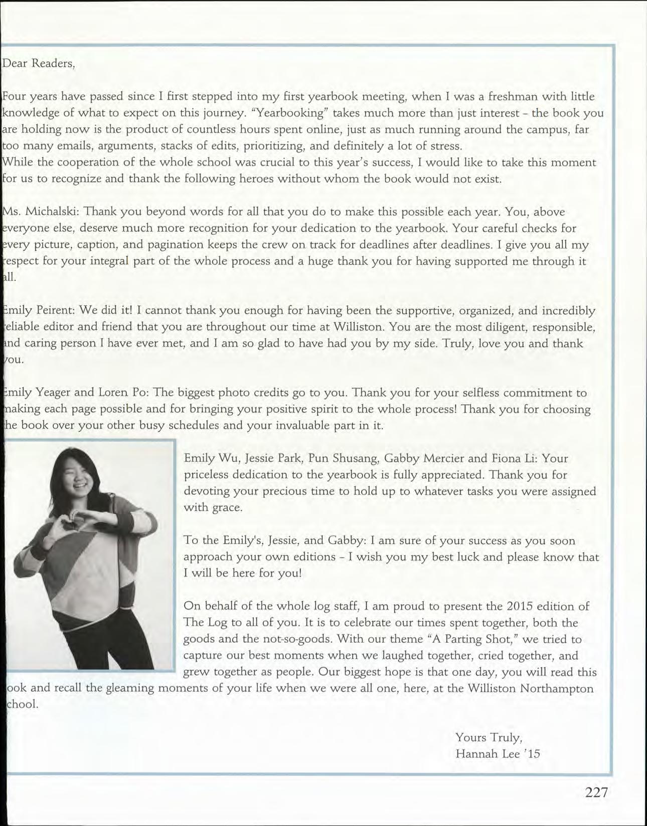 On behalf of the whole log staff, I am proud to present the 2015 edition of The Log to all of you. It is to celebrate our times spent together, both the goods and the not-so-goods. With our theme "A Parting Shot," we tried to capture our best moments when we laughed together, cried together, and grew together as people. Our biggest hope is that one day, you will read this ook and recall the gleaming moments of your life when we were all one, here, at the Williston Northampton hool.