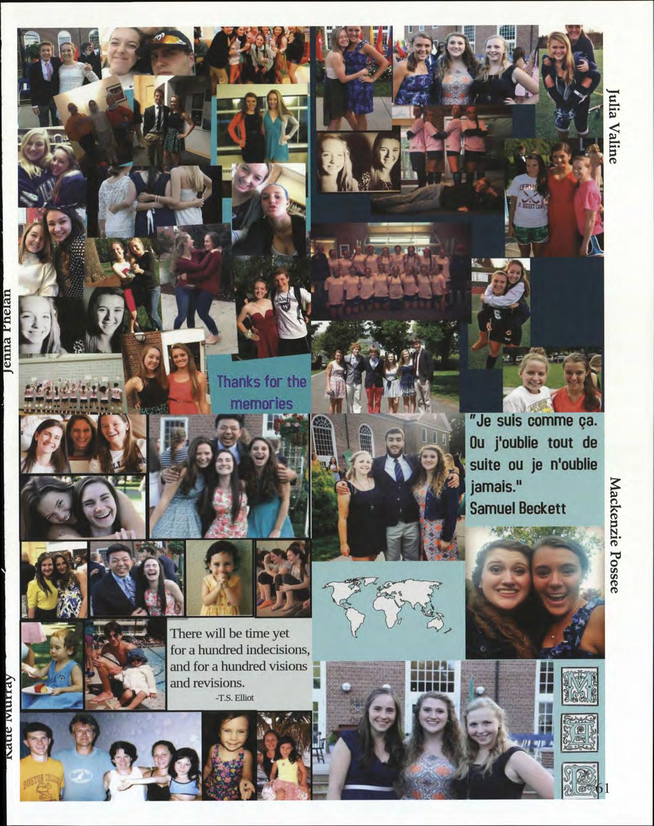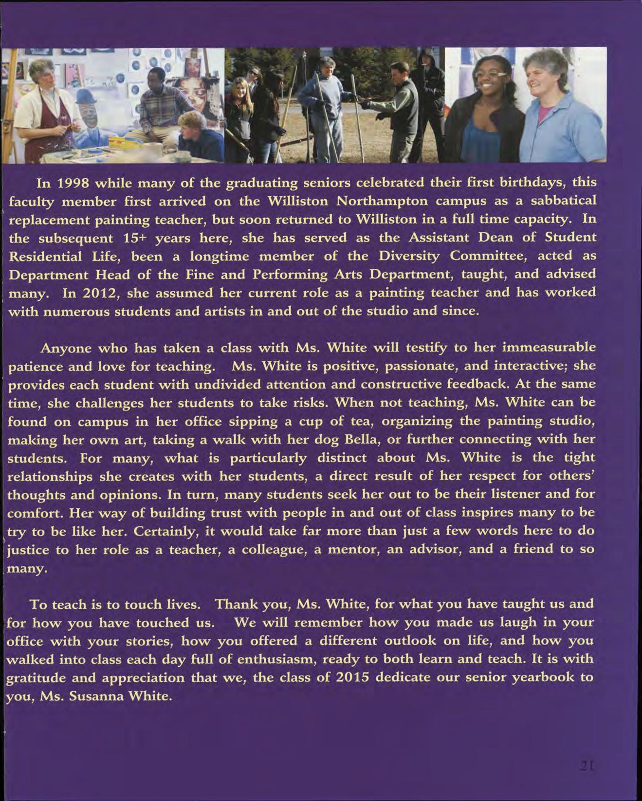 To teach is to touch lives. Thank you, Ms. White, for what you have taught us and for how you have touched us. We will remember how you made us laugh in your office with your stories, how you offered a different outlook on life, and how you walked into class each day full of enthusiasm, ready to both learn and teach. It is with gratitude and appreciation that we, the class of 2015 dedicate our senior yearbook to you, Ms. Susanna White.
