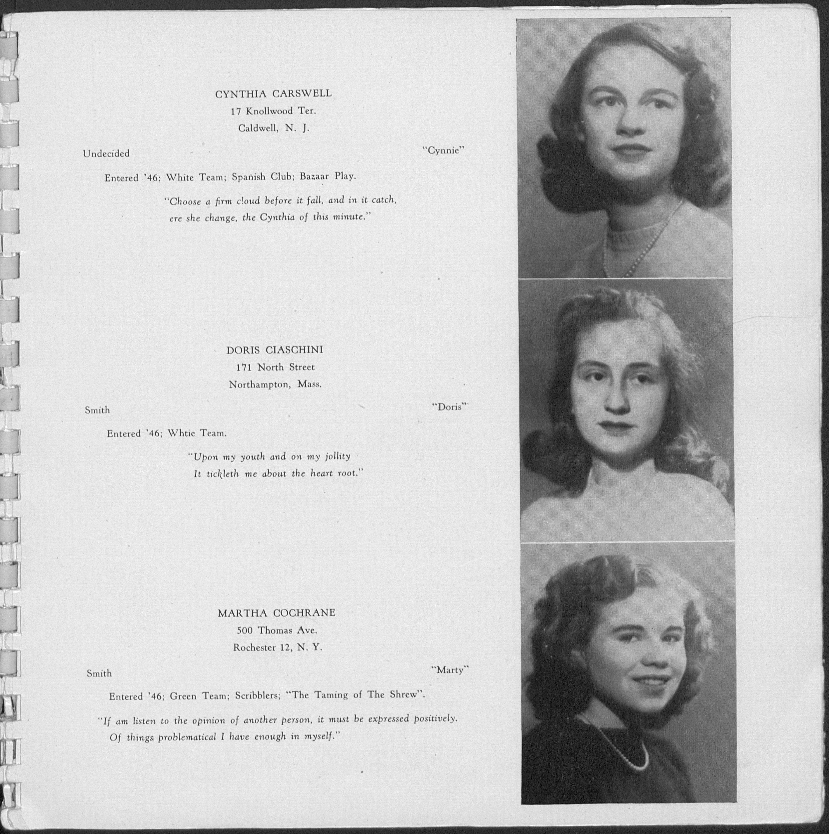 Mrs. Wright left the first week in April for her "little grey home in the 'West" (i.e. Wyoming) where she will take up her duties as housewife. With un-erring patience she stayed with us while we struggled through monocots and dicots,"Mr. Buchsbaum", CaCO3, and the electrolysis of brine. We wish her luck in her new home.