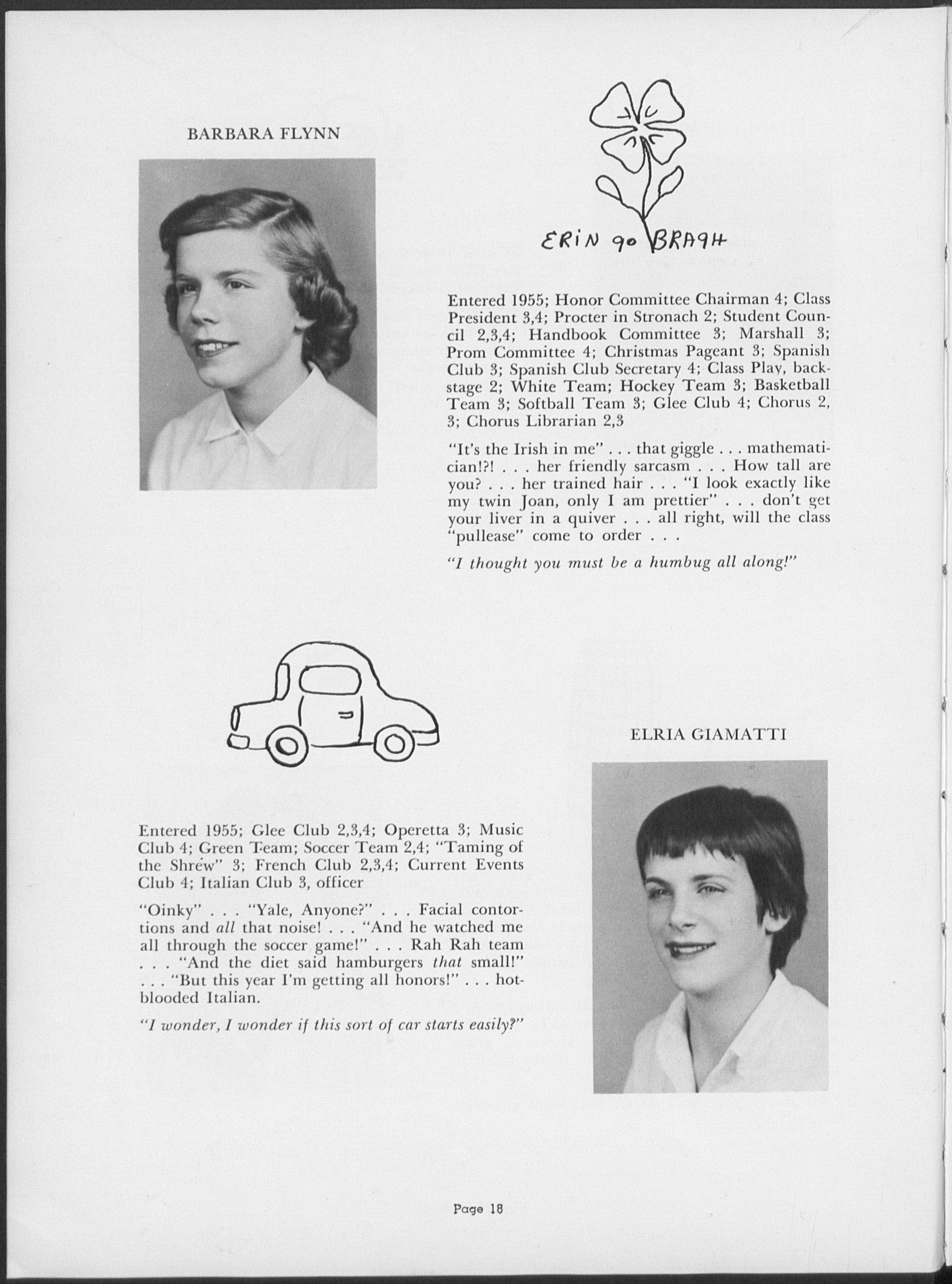 IEntered 1956; Honor Committee 4; Student Council 4; Chorus 3,4; Green team 3,4; Hockey team 3,4; Softball team 3; Mask and Wig 4; "Double Demon" 3; French Club 4; Current Events Club 4; Spanish Club 4; President of A. A. 4