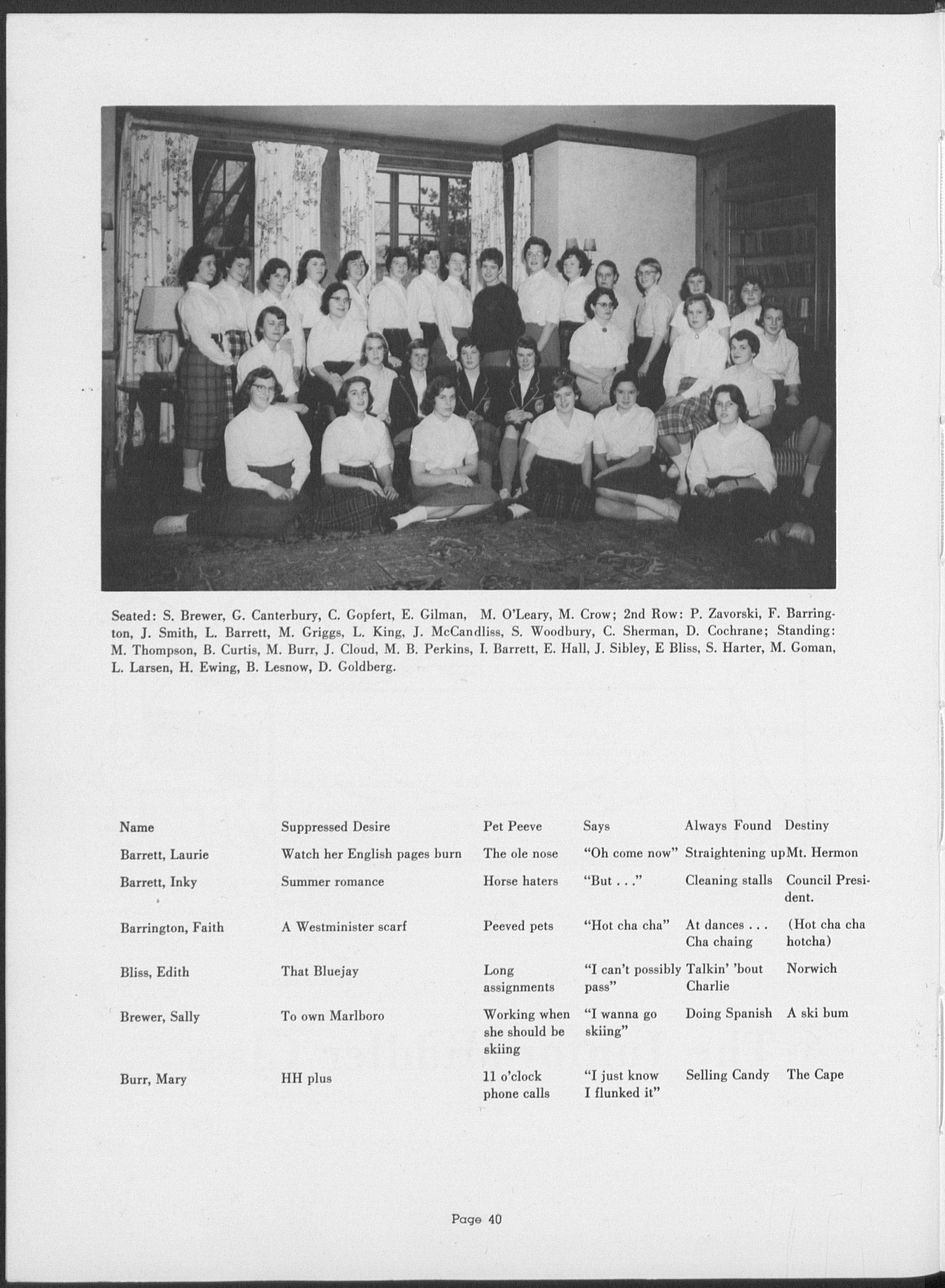 Seated Row One: J. Beauregard, J. Conklin, S. Miller, H. Copper, S. Hano, C. Balut, J. Durham. Row Two: E. Cramer, M. Miller, E. Butterworth, J. Reid, S. Crawford, secretary•treasurer. C. Barrington, president, Miss Carlson J. Taylor, vice-president, M. Blanchard, S. Berger, A. Cummings, A. Lauder, D. Flouton. Standing: L. DeBarbieri, E. Goldberg, D. Wickes, D. Rosapepe, M. B. Adams, B. Finn, E. Bartlett, E. Barrett, V. MacNair, J. Cordingley, M. Farrell, S. Mahoney, L. Russack, E. Hirshberg, C. Moran, S. Sturgis, F. Damon, K. Johnson.