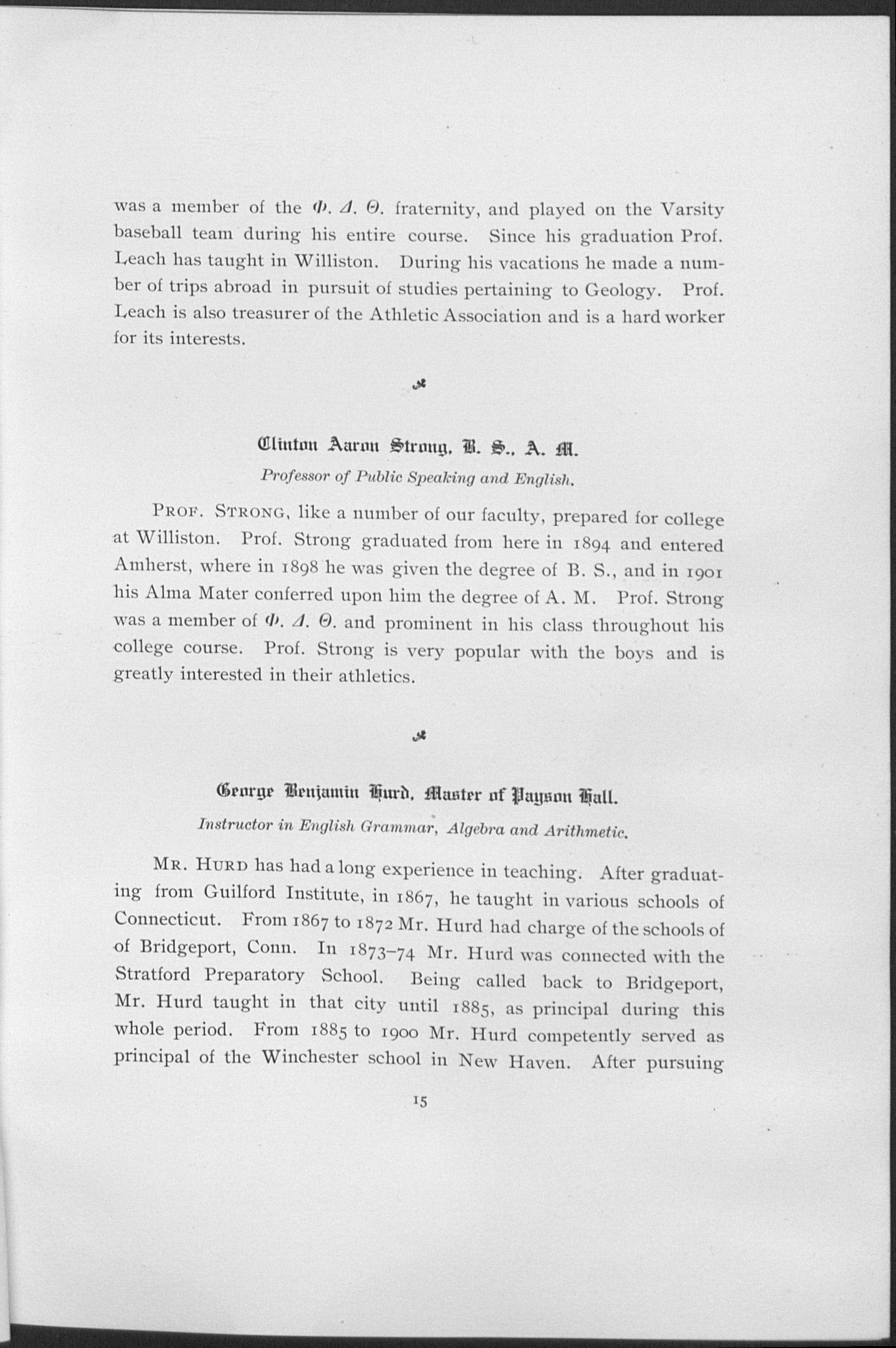 PROP. STRONG, like a number of our faculty, prepared for college at Williston. Prof. Strong graduated from here in 1894 and entered Amherst, where in 1898 he was given the degree of B. S., and in 19ox his Alma Mater conferred upon him the degree of A. M. Prof. Strong was a member of (1). 4. 0. and prominent in his class throughout his college course. Prof. Strong is very popular with the boys and is greatly interested in their athletics.