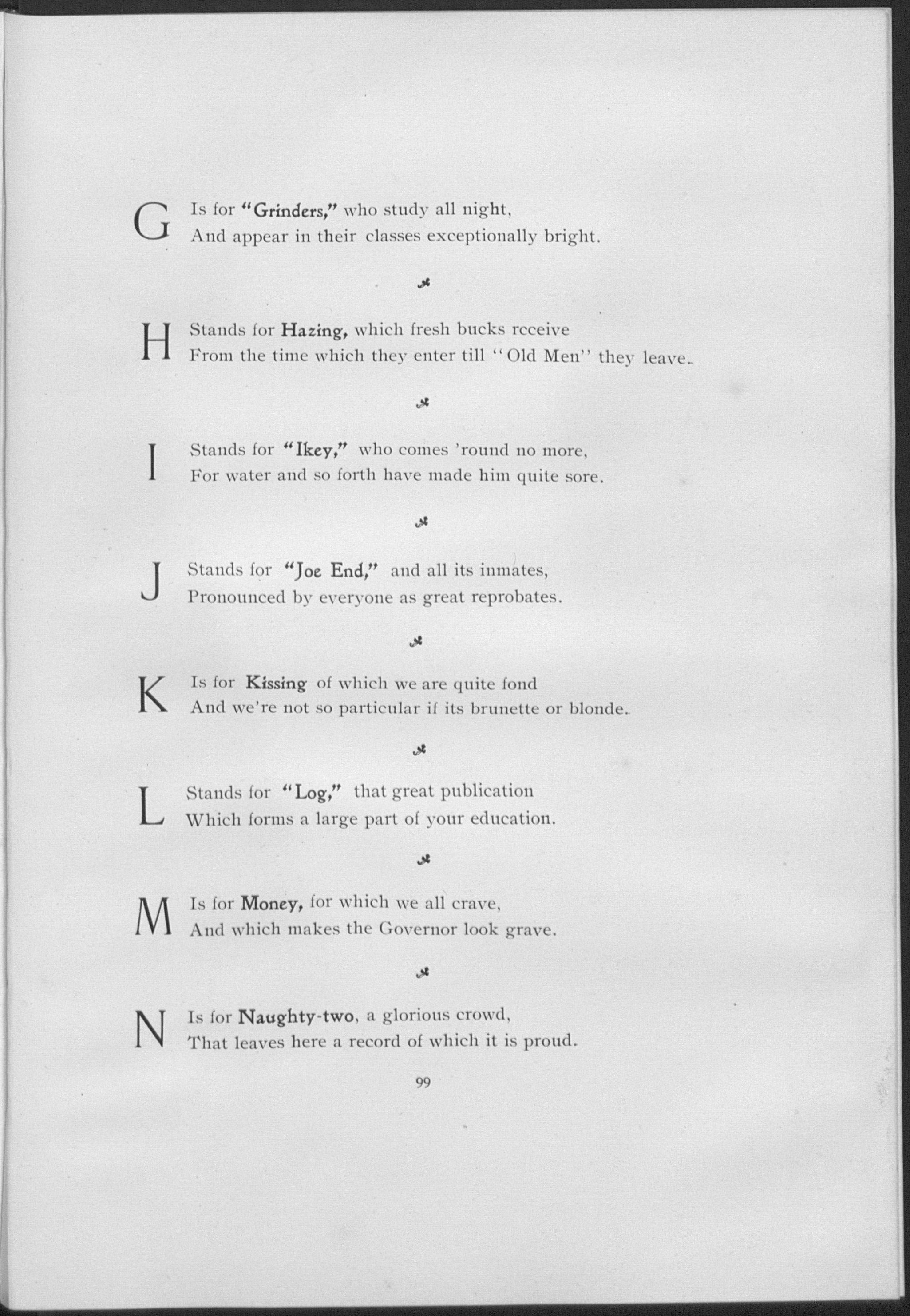 As thinking of the days of yore, When reigned the gray and blue A tender thought you may bestow On us of Nineteen-two.
