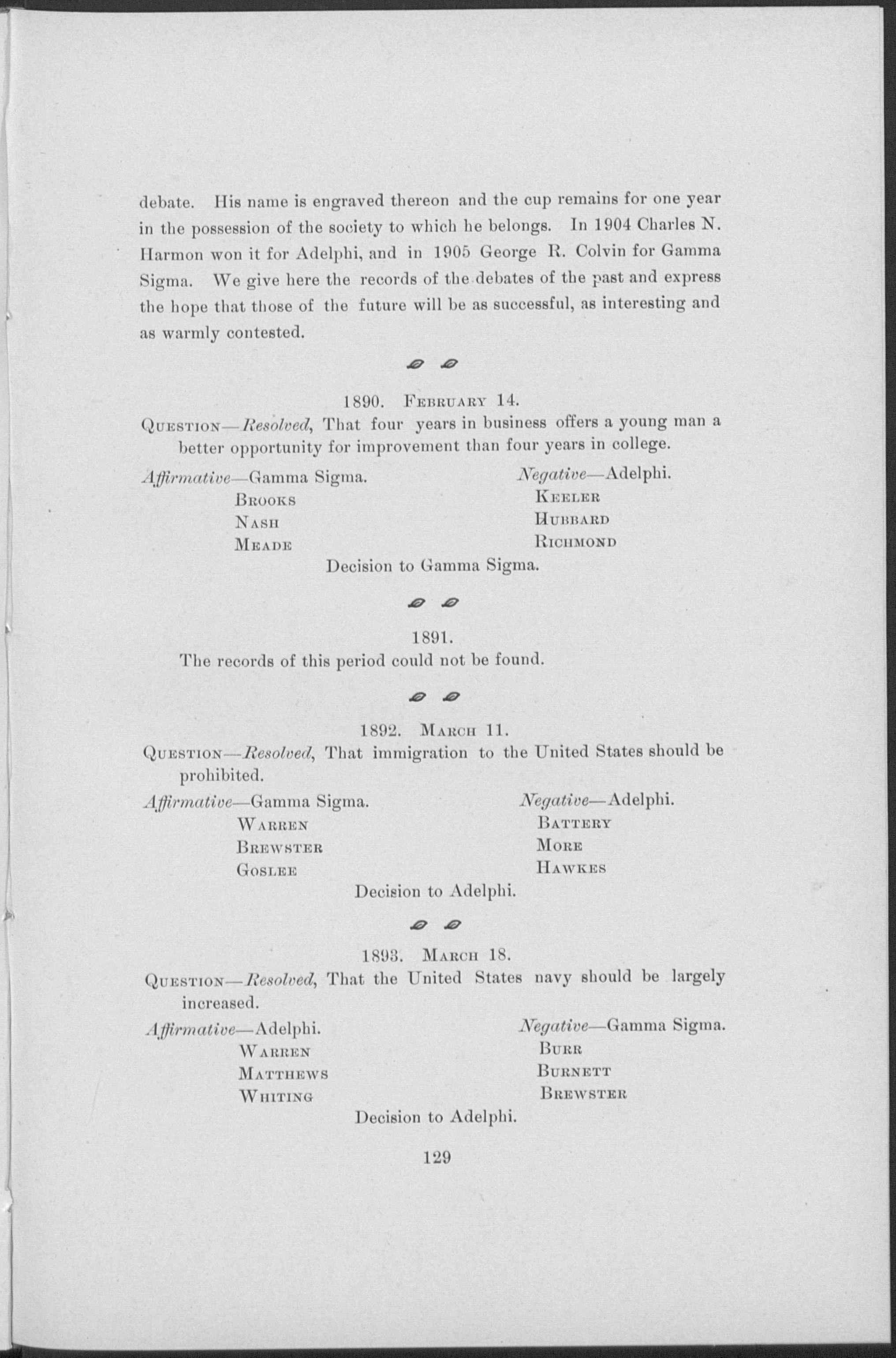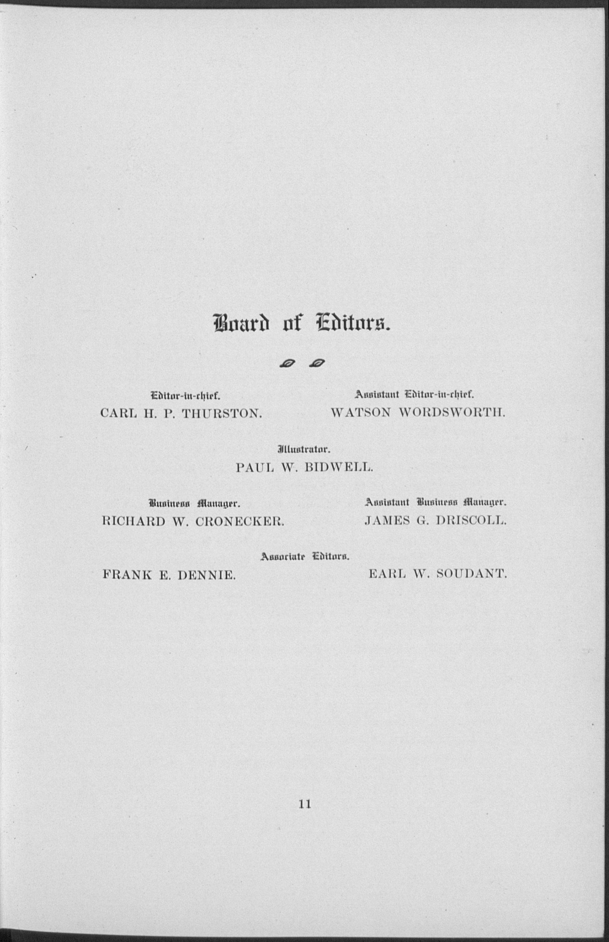 Memories will fade as time goes on, and the pleasures of school life will be replaced by sterner things; but the "Log" will remain unchanged. We like to look into the future and see our great lawyers and doctors, our teachers and statesmen, spending a pleasant hour over its pages, recalling the old school days. Many once familiar faces are seen, but some have drifted far away and others have long since taken their last examination in Life. They discuss the success of one and the failure of another, and how strangely Life has allotted her blanks and prizes. They laugh at the old jokes and grinds, and grow grave over the first acts of tragedies on which the curtain has just been rung down. And, at last, they reluctantly close the covers and Williston again fades from a reality to only a pleasant memory.
