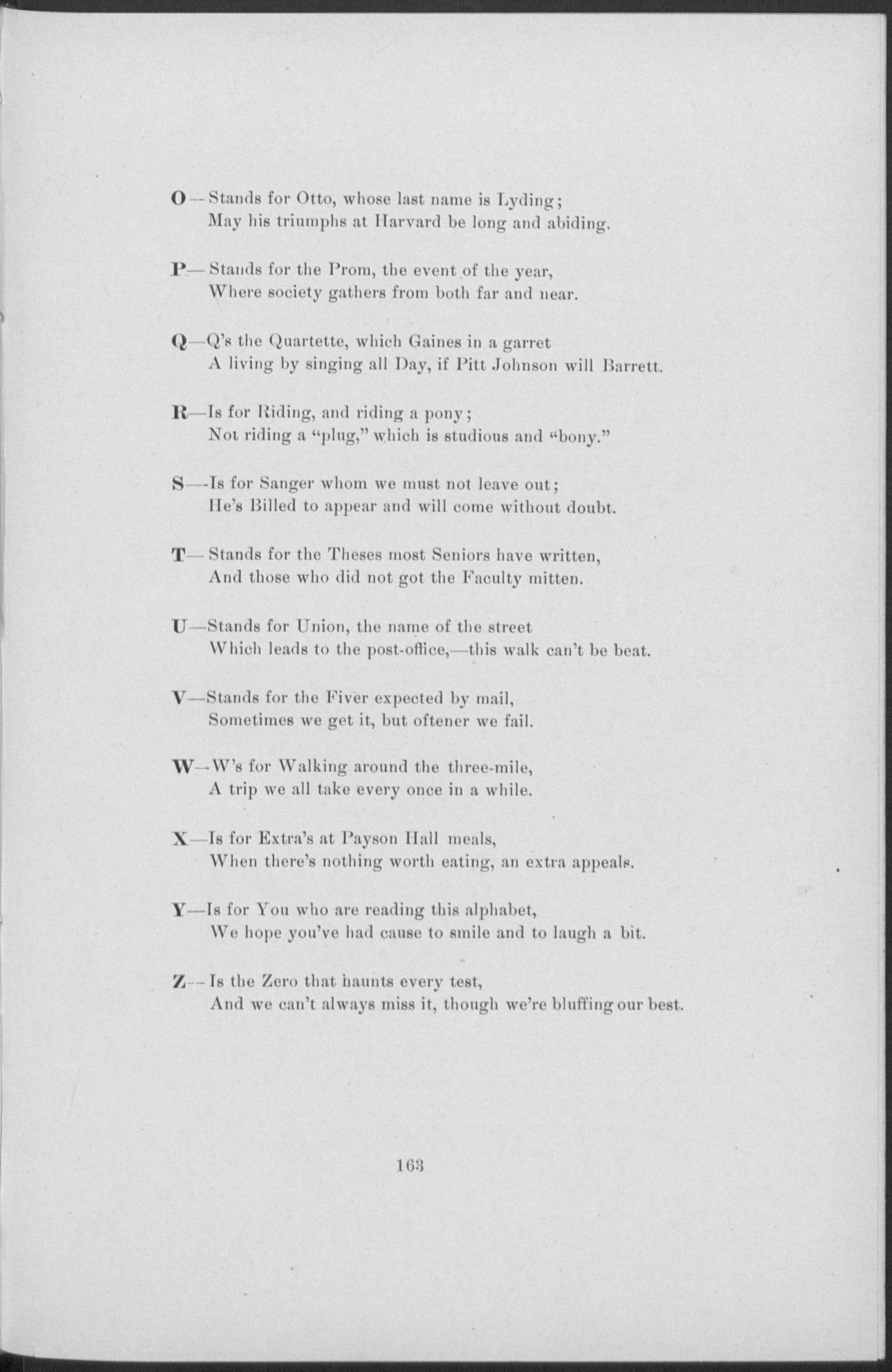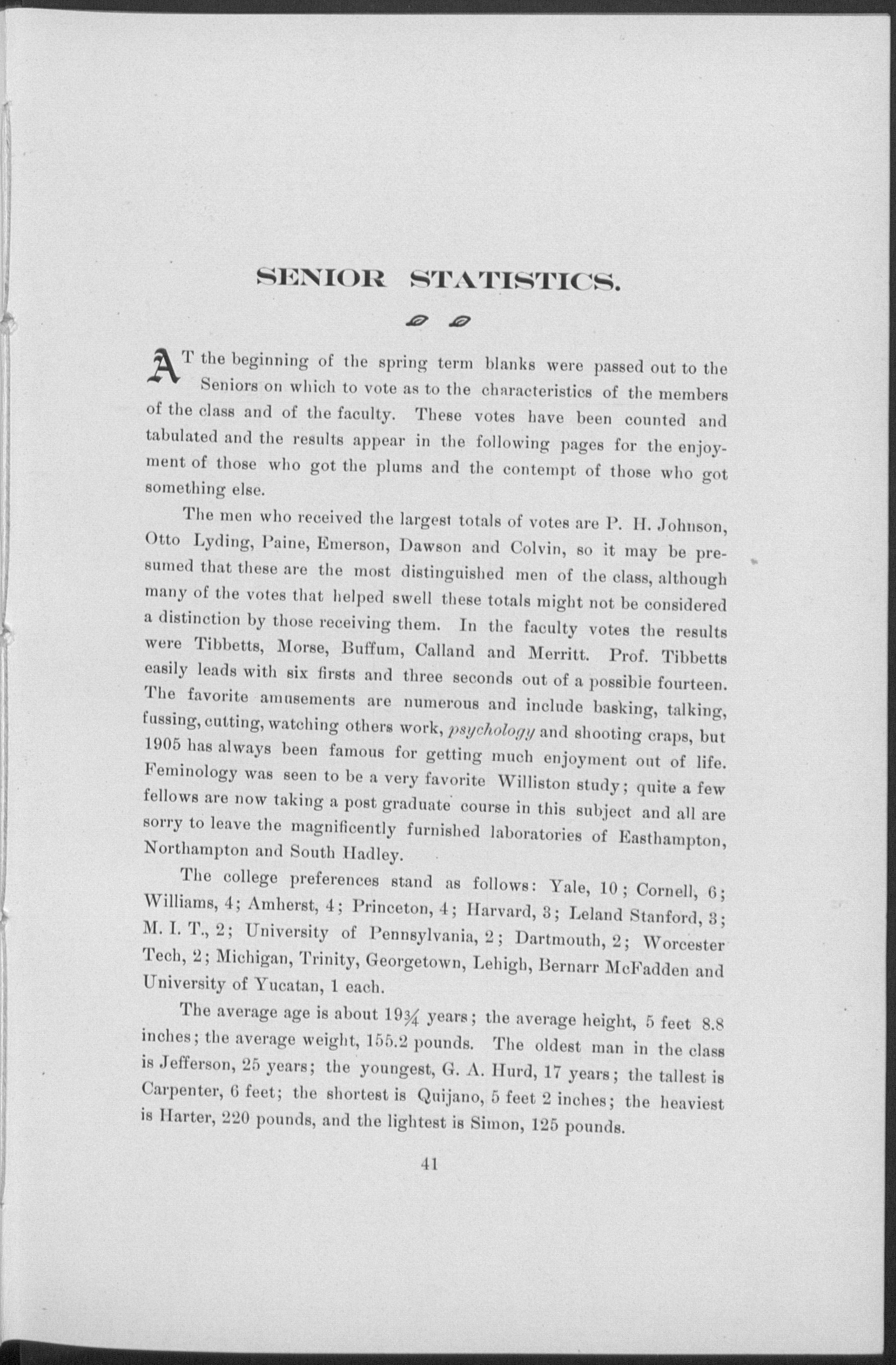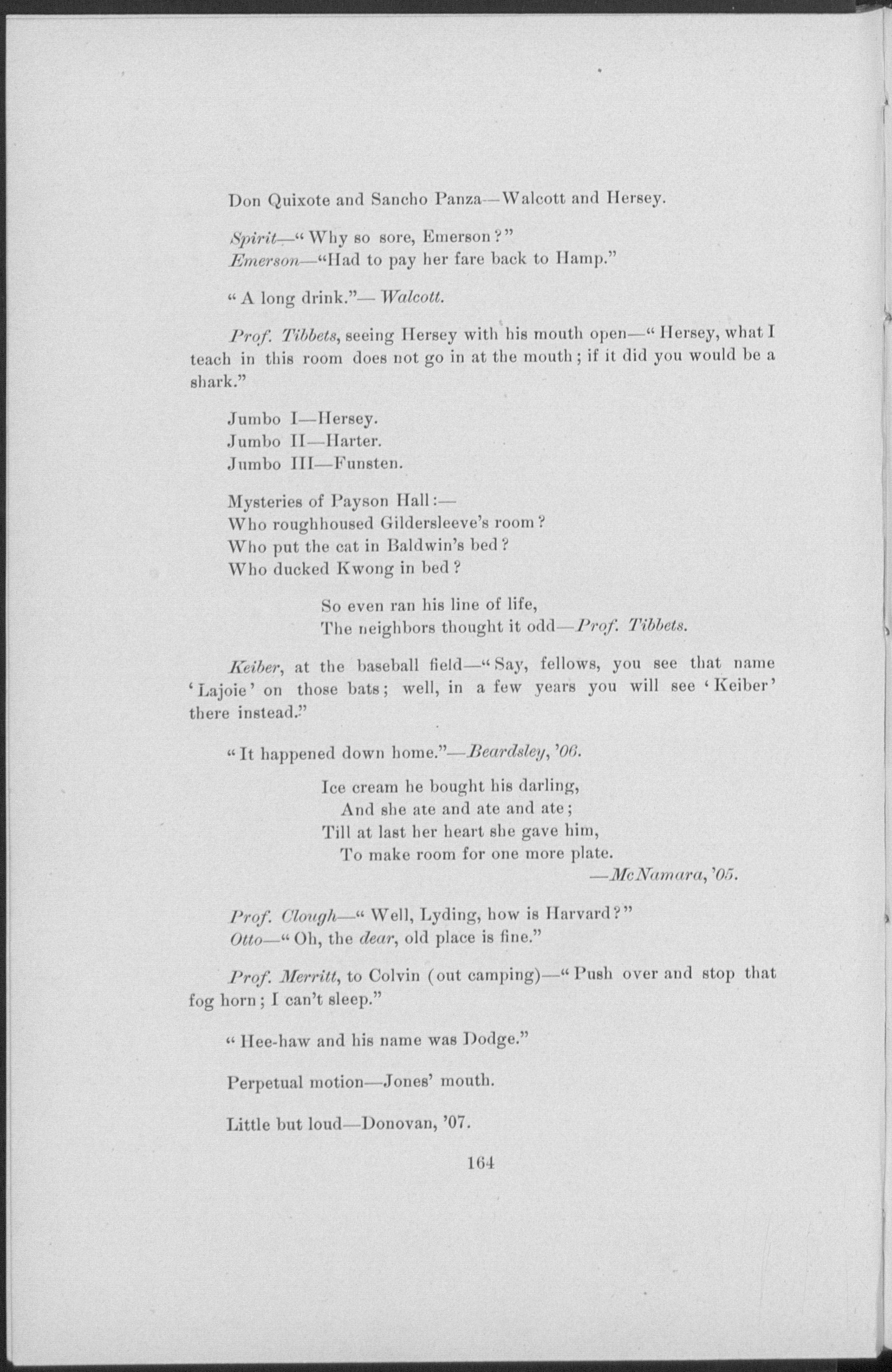 As our last year opened we had a few bucks, principally from Unionville high school, where they can't teach algebra, and the usual number of backsliders, foremost among whom is "Pit" Johnson ex '04, ex '03. Otto von Ludwig Henry Martin Lyding decided to stay and repeat a few subjects to show the fellows how well grounded they had been the year before. Fat Seymour who had been waiting for another odd year to come along next got on—but we have already overstepped the space allowed us. A tree is known by its fruits. To know more of '05 read on through these pages.