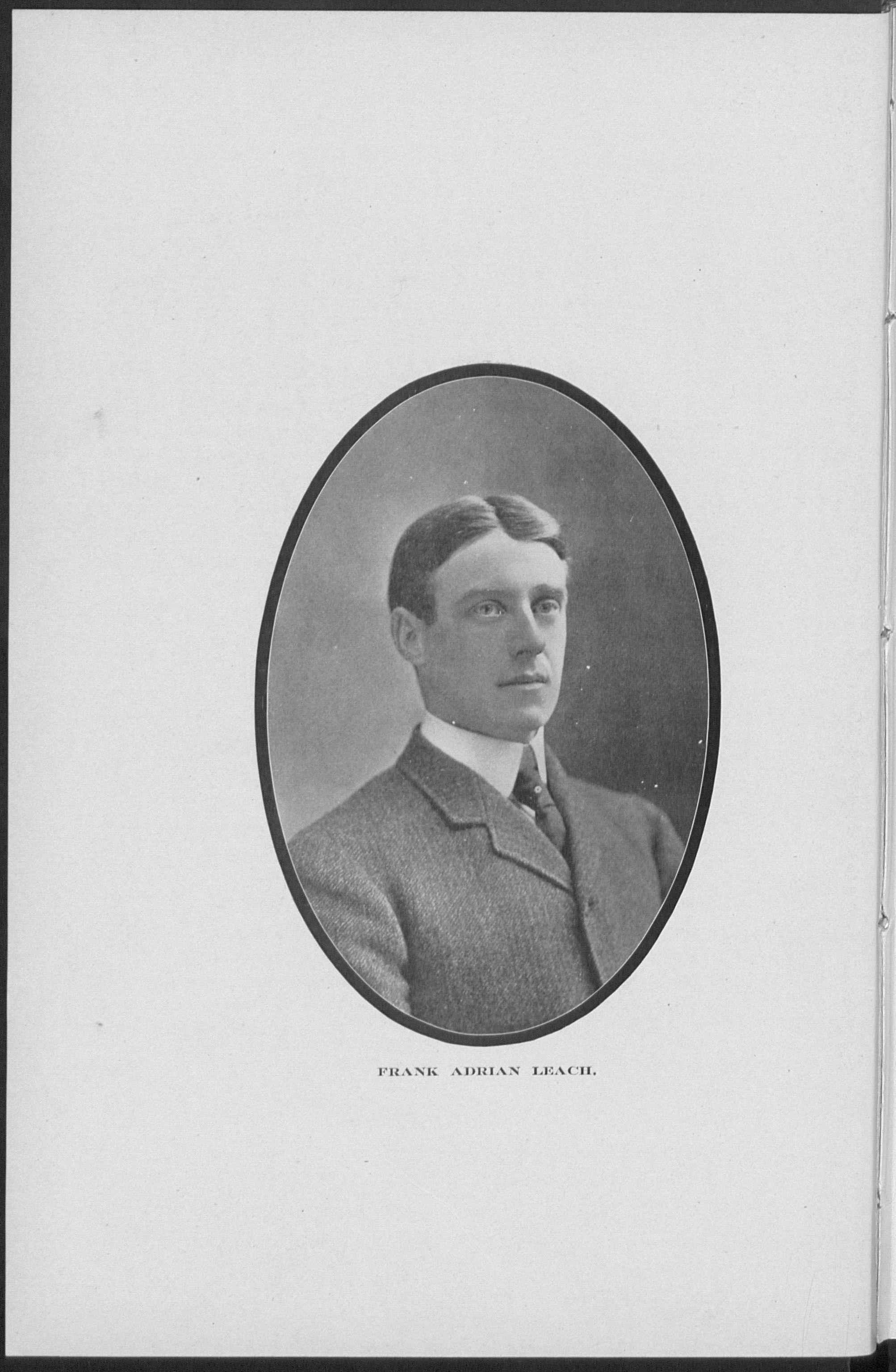 On the nineteenth of January, 1905, Professor Frank Adrian Leach died of pneumonia at the Presbyterian Hospital, New York City. His work at Williston began in September, 1892, during the administration of Dr. William Gallagher. Professor Leach came to Williston directly from Amherst College, where he had gained an enviable reputation both as an athlete and as a scholar. During the first year his work was done in the department of athletics, of which he was practically the responsible director during his entire twelve years' service. In 1893 he was transferred to the Science Department and made professor of Chemistry and Biology. His sweet, sympathetic nature made him a great favorite with his pupils and they found themselves inspired by his enthusiasm. His 8
