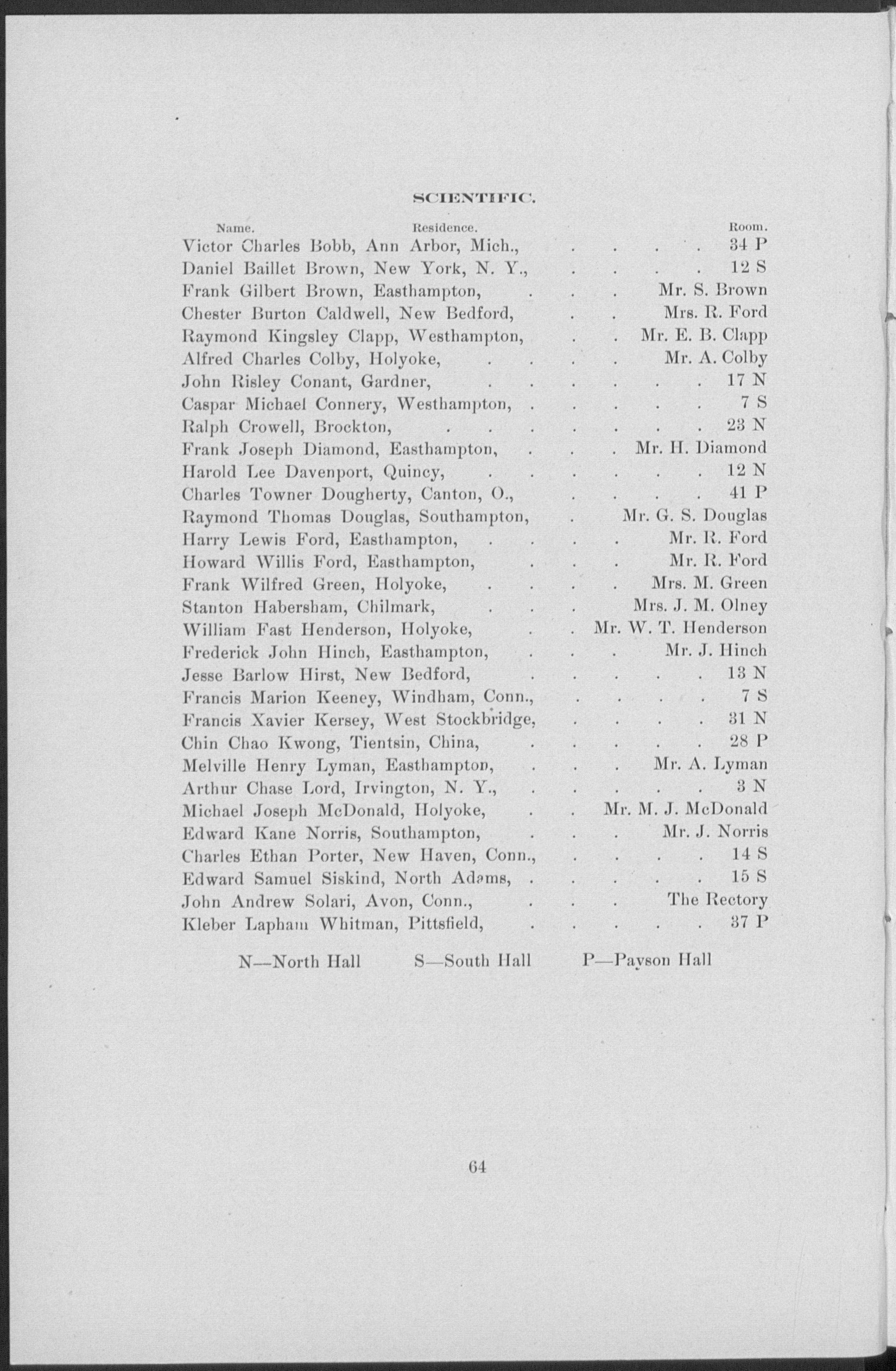 ILLISTON SEMINARY is situated in the beautiful village of Easthampton, Mass., in the very center of a cluster of educational institutions. The founding of the school originated in the mind of the Hon. Samuel Williston, a man whom hundreds of young men and women have learned to love and respect. After years of thought and deliberation as to the best method of bestowing his charities, Mr. Williston decided to found Williston Seminary for young mei) and women. In February, 1841, work was begun, and in December of the same year the school was opened to students. The institution then consisted of one two-story wooden building. Students remained in the school-room to study under the direction of the principal, Luther Wright. The first building was found to be inadequate for the school was popular from the first and had opened with a roll of ninety names. Hence, in 1844,a second building— the present Middle Hall—was erected. This was a three-story building containing dormitories and recitation rooms. In March, 1857,the original building was destroyed by fire and the present South Hall was erected in its place. The Gymnasium was built in 1864, and North Hall in 1866. Later, the Mansion House was purchased and became Payson Hall, the School Cottage and Dining Hall. In 1872,the Astronomical Observatory was erected, and furnished with a sextant and a five-inch refracting telescope. In 1864, the School ceased to be co-educational, and it has since then been a school for boys.