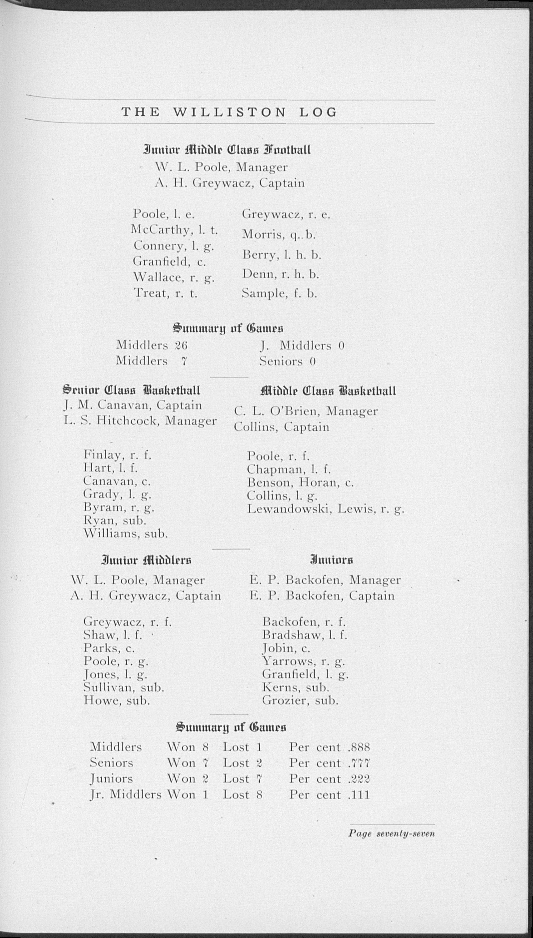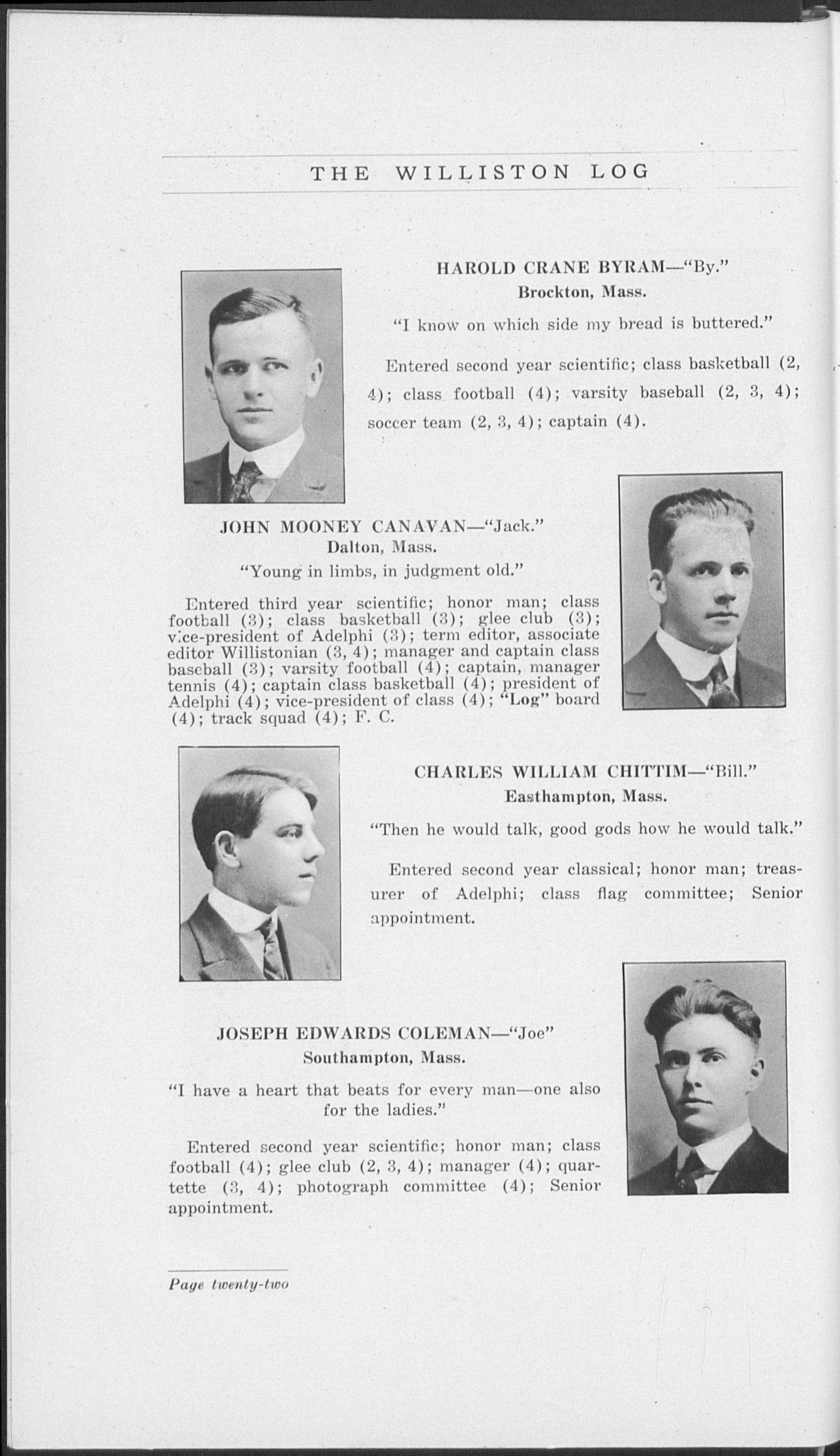 Entered third year scientific; honor man; class football (3); class basketball (3); glee club (3); v:ce-president of Adelphi (3); term editor, associate editor Willistonian (3, 4); manager and captain class baseball (3); varsity football (4); captain, manager tennis (4); captain class basketball (4); president of Adelphi (4); vice-president of class (4);"Log" board (4); track squad (4); F. C.